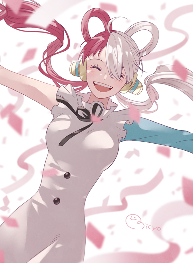 1girl ^_^ arms_up black_ribbon buttons closed_eyes cowboy_shot dress floating_hair frilled_dress frills hair_over_one_eye headphones micyomon multicolored_hair one_piece one_piece_film:_red petals red_hair ribbon signature smile solo twintails two-tone_hair uta_(one_piece) white_dress white_hair