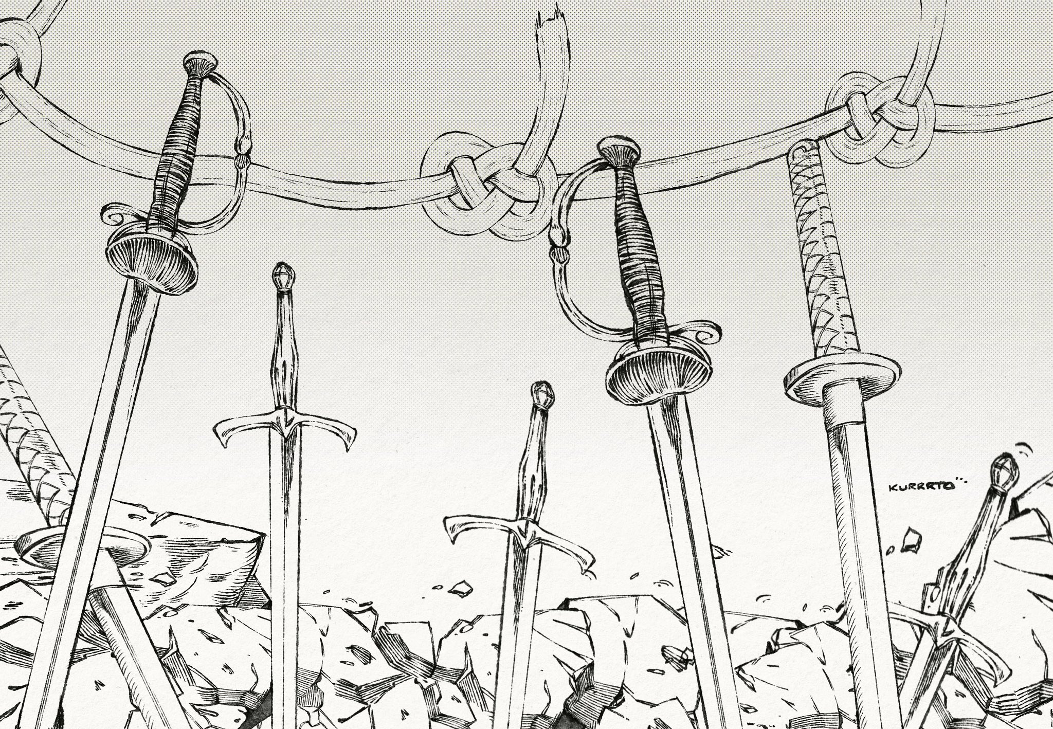 artist_name domain_expansion halftone highres jpeg_artifacts jujutsu_kaisen katana knot kurrrto monochrome multiple_swords multiple_weapons no_humans planted planted_sword planted_weapon rock rope saber_(weapon) signature simple_background sword traditional_media weapon