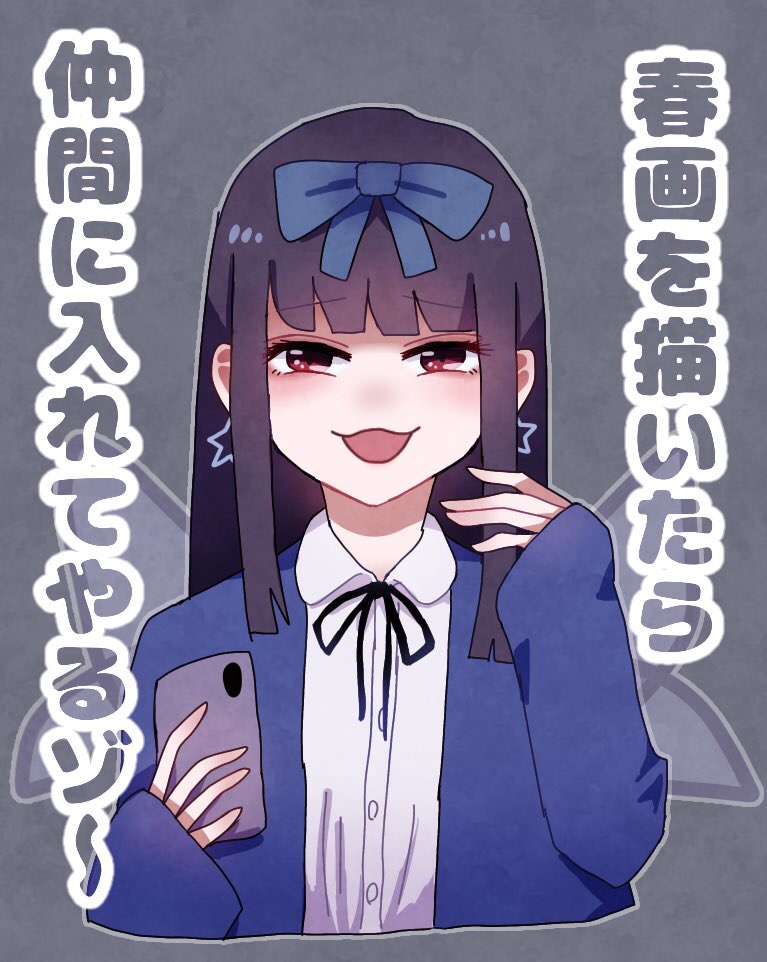 1girl :3 black_ribbon blue_bow blue_jacket blunt_bangs blush bow buttons cellphone collared_shirt commentary_request cookie_(touhou) earrings fairy_wings grey_background hair_bow hime_cut holding holding_phone jacket jewelry long_hair looking_at_viewer neck_ribbon open_mouth phone red_eyes ribbon shirt shunga_youkyu sidelocks simple_background smartphone smile solo star_(symbol) star_earrings star_sapphire tohokune touhou translation_request upper_body white_shirt wings