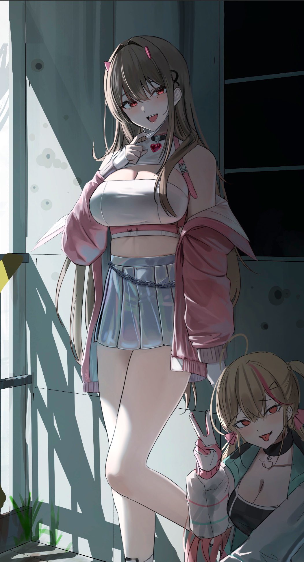 2girls blonde_hair chain choker crop_top fingerless_gloves gloves goddess_of_victory:_nikke hana_hebi highres horns jackal_(nikke) jacket long_hair mask mouth_mask multiple_girls pink_eyes pink_jacket skirt stairs stairwell unfinished v viper_(nikke) window