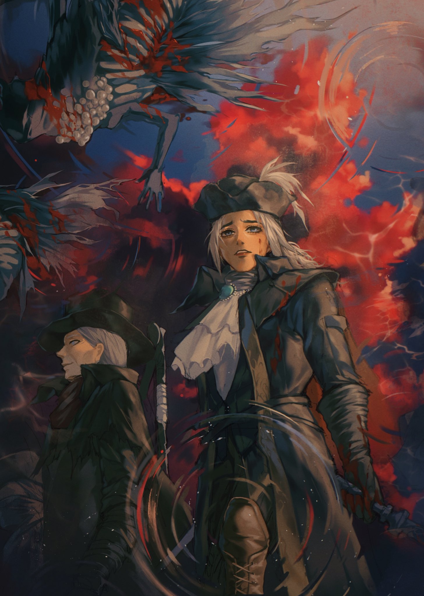 1boy 1girl ascot blood blood_stain bloodborne blue_eyes burial_blade coat double_blade gehrman_the_first_hunter gem gloves hat hat_feather highres holding holding_weapon lady_maria_of_the_astral_clocktower long_hair looking_at_viewer ponytail rakuyo_(bloodborne) scarf scythe short_hair smile sword top_hat tricorne weapon white_ascot white_hair yujia0412