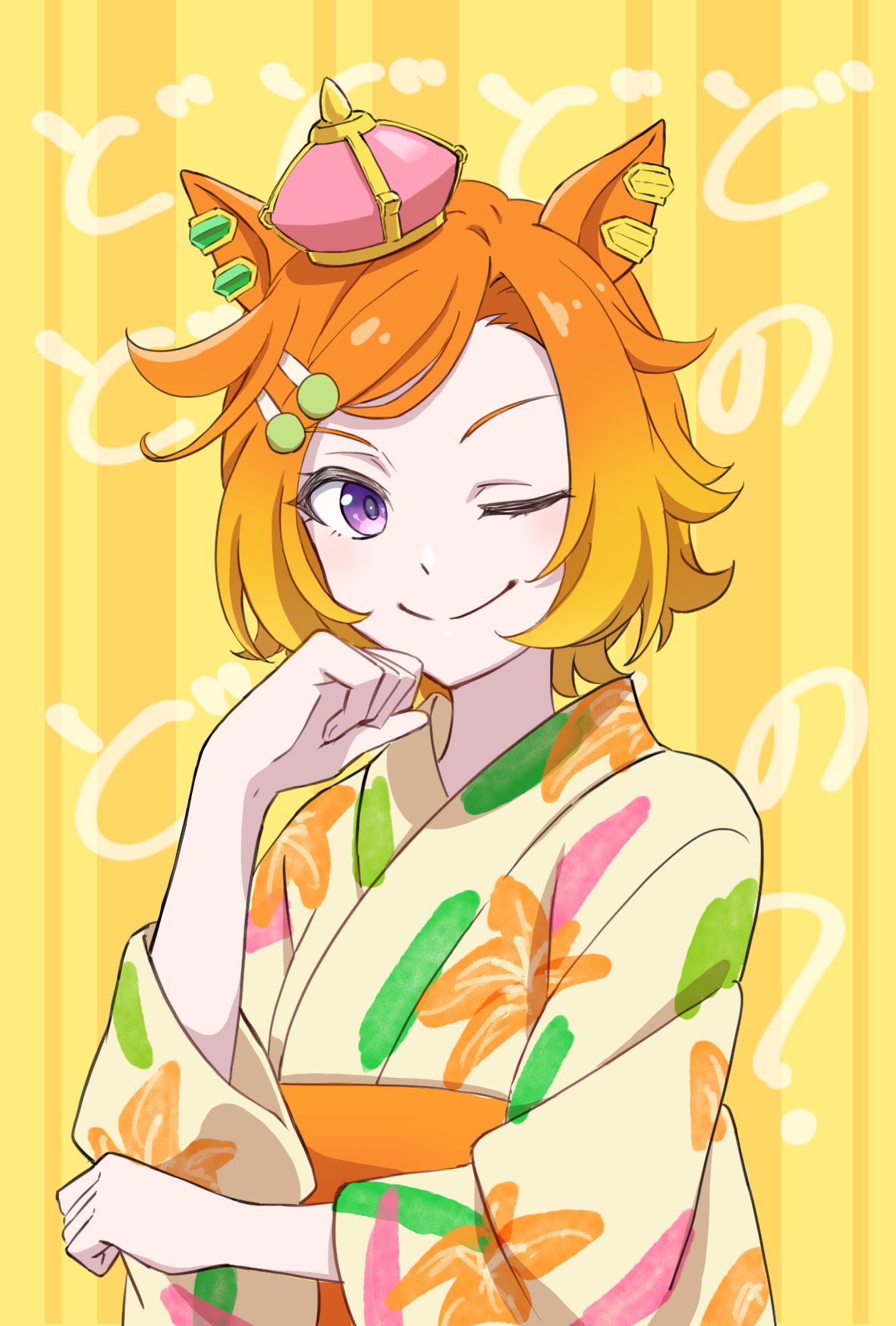 1girl alternate_costume animal_ears closed_mouth cofee_fan crown earclip hair_ornament hairclip highres horse_ears japanese_clothes kimono long_sleeves looking_at_viewer mini_crown obi one_eye_closed orange_hair piercing purple_eyes sash short_hair smile solo t.m._opera_o_(umamusume) umamusume upper_body yellow_background yellow_kimono