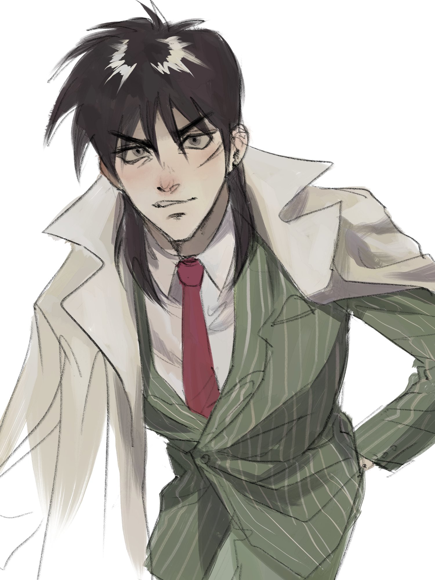 1boy black_eyes black_hair coat coat_on_shoulders collared_shirt commentary_request cowboy_shot facial_scar formal_clothes green_jacket hair_between_eyes hand_in_pocket highres itou_kaiji jacket tobaku_mokushiroku_kaiji korean_commentary long_bangs long_hair looking_at_viewer male_focus necktie panespaghetti red_necktie scar scar_on_cheek scar_on_face shirt simple_background solo striped_clothes striped_jacket suit v-shaped_eyebrows vertical-striped_clothes vertical-striped_jacket white_coat white_shirt