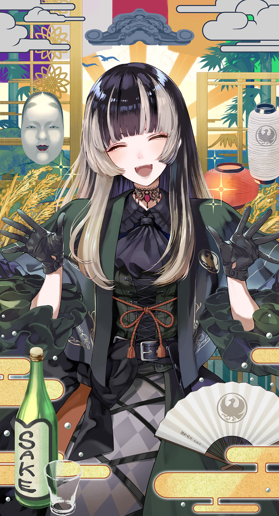 1girl alcohol bamboo belt bird black_belt black_dress black_gloves black_hair black_suit blunt_bangs bottle closed_eyes cloud commentary_request dress egasumi formal_clothes glass glass_bottle gloves gothic_lolita grey_hair hand_fan highres hololive hololive_dev_is japanese_clothes jewelry juufuutei_raden juufuutei_raden_(1st_costume) lantern lolita_fashion long_hair mask multicolored_hair necklace noh_mask open_mouth ribbon sake sake_bottle sidelocks smile sparkle streaked_hair suit sunburst sunburst_background takechi_akinobu teeth upper_teeth_only virtual_youtuber wheat