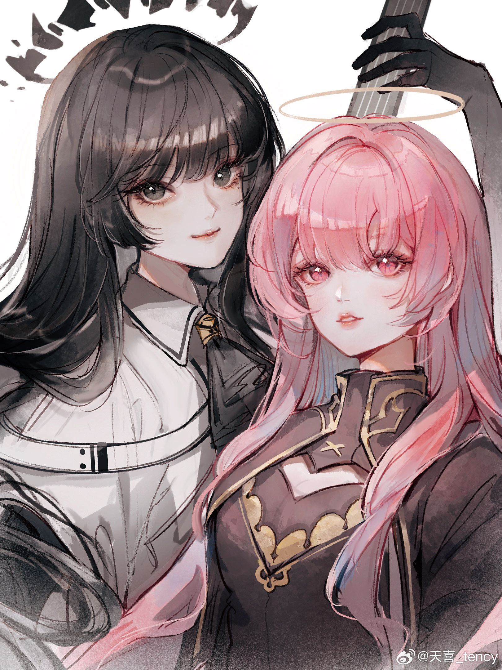 2girls arknights bad_source black_eyes black_hair hair_between_eyes halo highres instrument lemuen_(arknights) long_hair looking_at_viewer multiple_girls pink_eyes pink_hair tency_(1733djy) virtuosa_(arknights) watermark weibo_watermark white_background