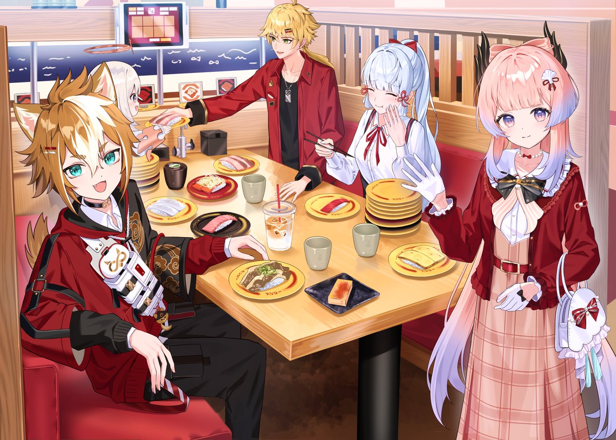 2boys 3girls alternate_costume ayaka_(genshin_impact) bag belt black_bow blue_hair bow bow-shaped_hair closed_eyes closed_mouth collar colored_tips dress eating food genshin_impact glove_bow gloves gorou_(genshin_impact) gorou_(sushiro)_(genshin_impact) hair_bow half_gloves halo jacket jewelry komiya_latte long_hair long_sleeves looking_at_viewer multicolored_hair multiple_boys multiple_girls necklace official_alternate_costume open_clothes open_jacket outdoors paimon_(genshin_impact) pink_dress pink_hair ponytail purple_eyes red_belt red_bow red_jacket red_ribbon ribbon sangonomiya_kokomi sangonomiya_kokomi_(sushiro) shirt sidelocks sitting smile standing striped_clothes striped_dress sushi thoma_(genshin_impact) waving white_bag white_collar white_gloves white_shirt