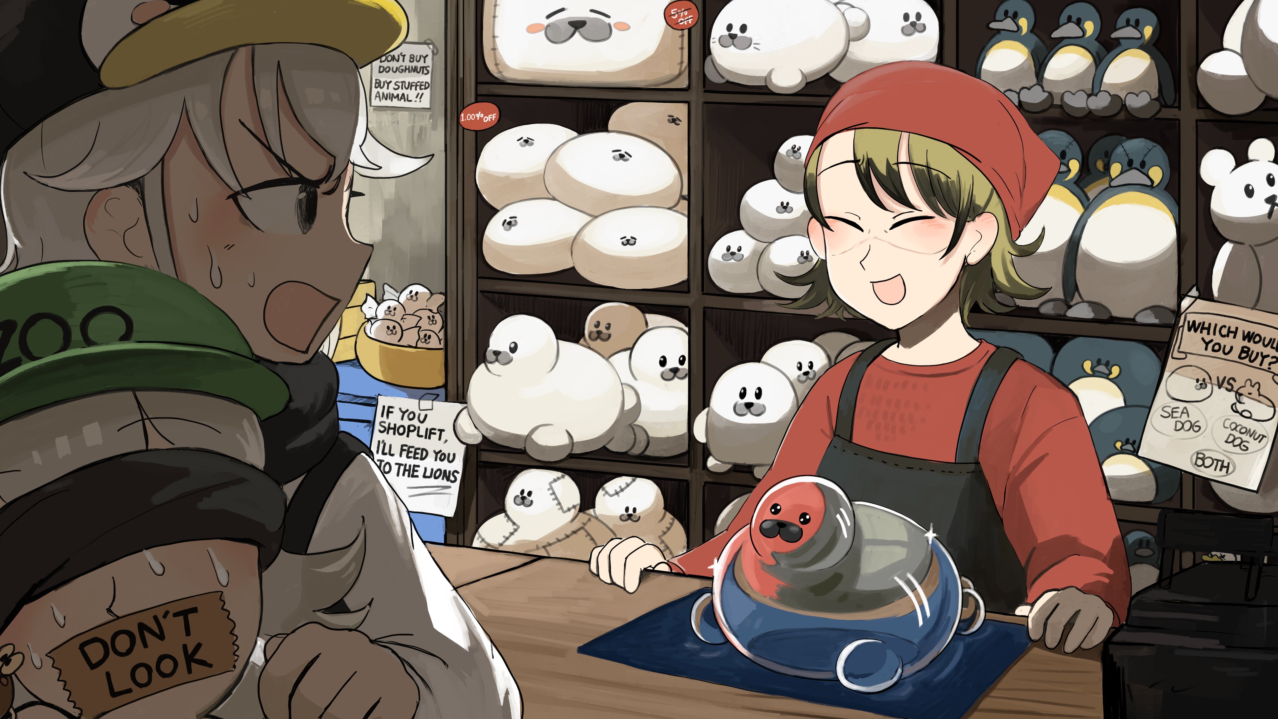 3girls :d absurdres bird black_overalls blindfold blonde_hair closed_eyes commentary diva_(hyxpk) donut_stamp duck english_commentary gag glint green_hat grey_hair hat highres improvised_gag multiple_girls nervous_sweating note open_mouth overalls penguin_hat penguin_keeper_(diva) red_headwear red_shirt seal_keeper_(diva) shirt short_hair slice_of_life smile store_keeper_(diva) stuffed_animal stuffed_penguin stuffed_polar_bear stuffed_seal stuffed_toy sweat tape tape_gag transparent white_shirt zoo zookeeper zookeepers_(diva)