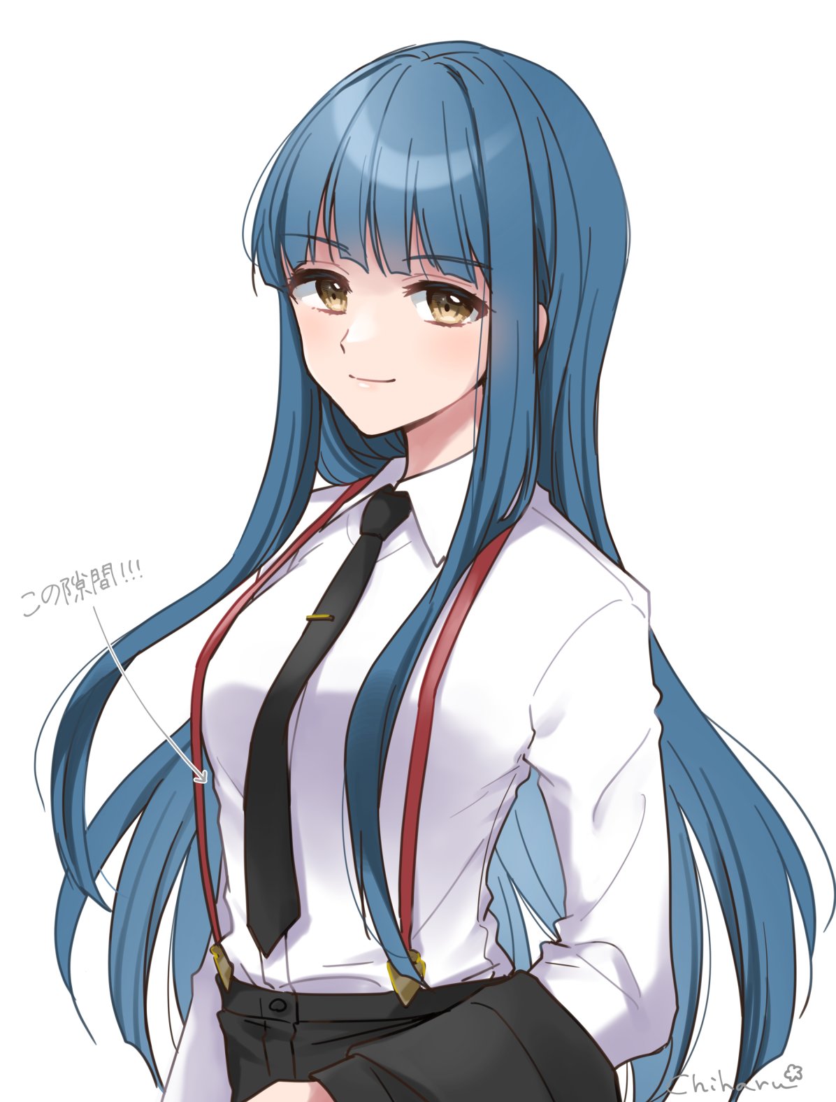1girl arrow_(symbol) black_necktie black_pants blue_eyes blunt_bangs denim dress_shirt eyelashes hair_down highres hime_cut idolmaster idolmaster_million_live! idolmaster_million_live!_theater_days jeans kitakami_reika light_smile long_hair long_sleeves looking_at_viewer necktie pants pqpqpq783 shirt signature solo suspenders very_long_hair white_background white_shirt wing_collar yellow_eyes