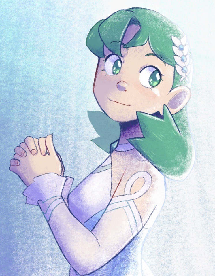 1girl blue_dress choker detached_sleeves dress green_eyes green_hair kris_(pokemon) kris_(sygna_suit)_(pokemon) nintendo official_alternate_costume own_hands_together pokemon pokemon_masters_ex random_minty solo upper_body white_choker