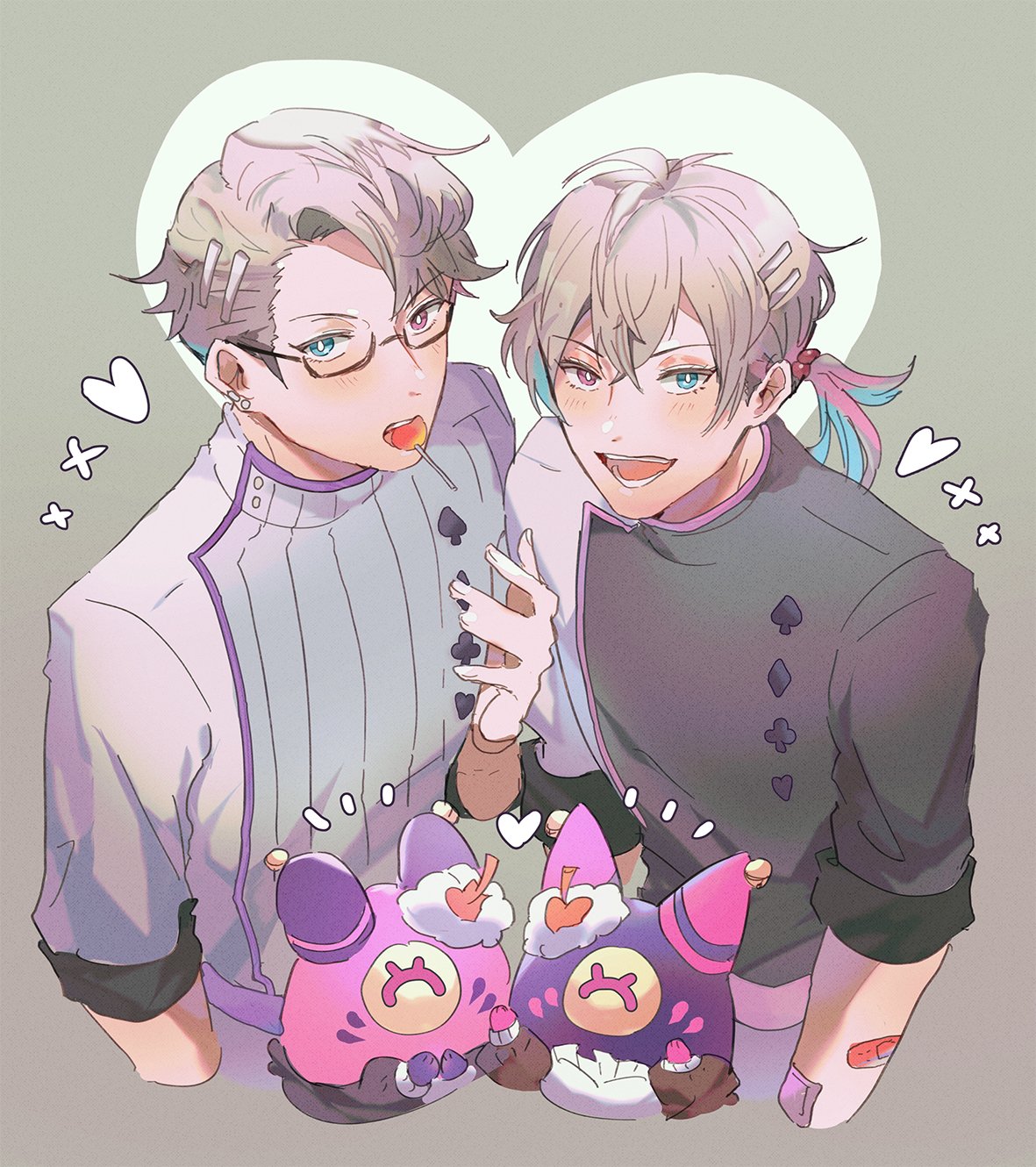 2boys alternate_costume alternate_hairstyle bandaid bandaid_on_arm bettel_2_(gavis_bettel) bishounen blue_eyes blue_hair blush brothers candy commentary creature english_commentary eyeshadow food gavis_bettel glasses grey_background grey_hair hair_between_eyes heart heterochromia highres holostars holostars_english lollipop looking_at_viewer low_side_ponytail makeup male_focus medium_hair multicolored_hair multiple_boys one-eyed open_mouth phantom_(gavis_bettel) pink_eyes pink_hair riz_tempura short_hair siblings side_ponytail sketch smile streaked_hair twins upper_body virtual_youtuber