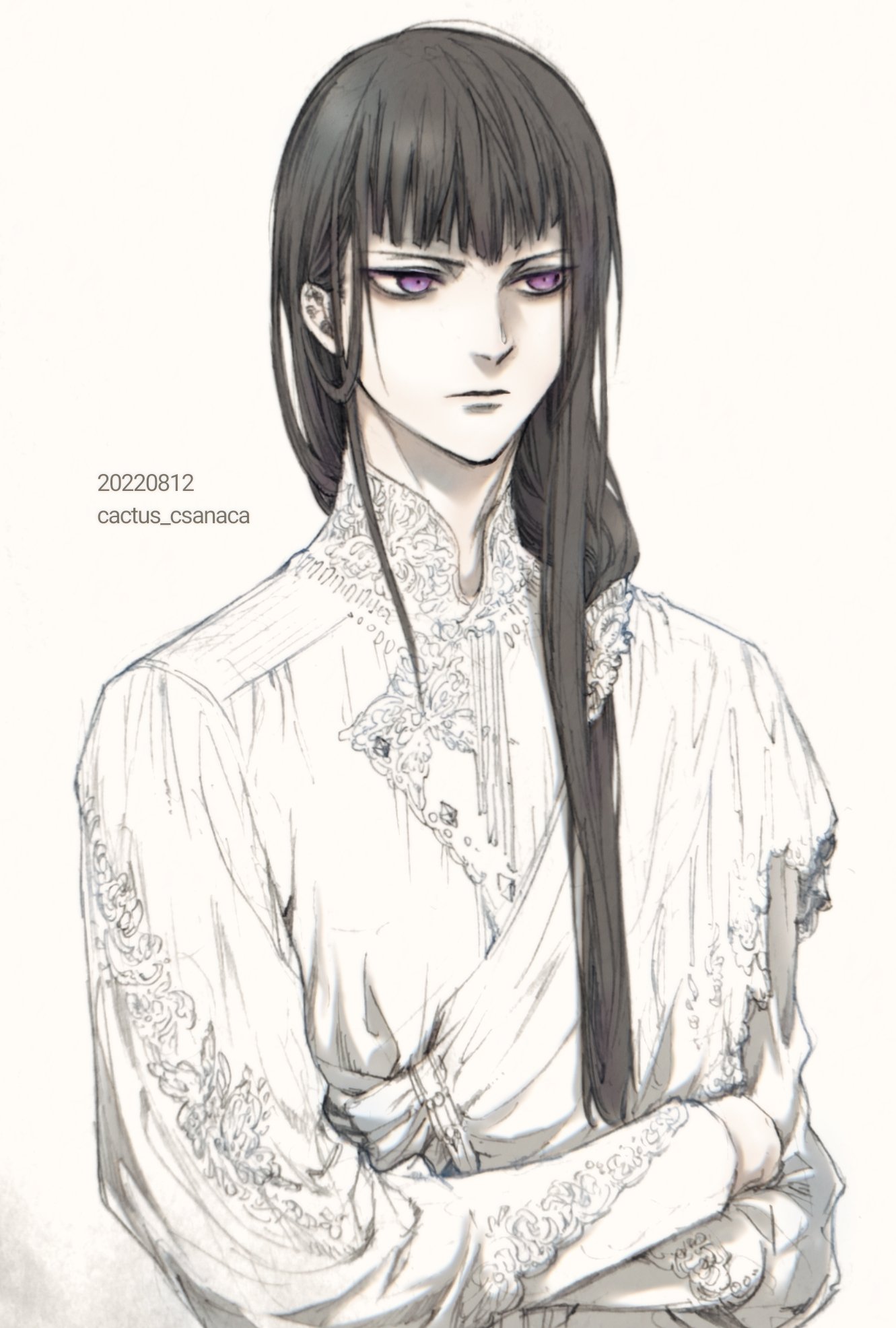 1boy androgynous closed_mouth crossed_arms csanaca dated formal_clothes hair_over_shoulder harrison_dirk higeki_no_genkyou_tonaru_saikyou_gedou_last_boss_joou_wa_tami_no_tame_ni_tsukushimasu highres lace lace-trimmed_shirt lace_trim long_hair long_sleeves looking_ahead low-tied_long_hair male_focus pale_skin puffy_long_sleeves puffy_sleeves purple_eyes shirt simple_background sketch solo twitter_username upper_body white_background white_shirt