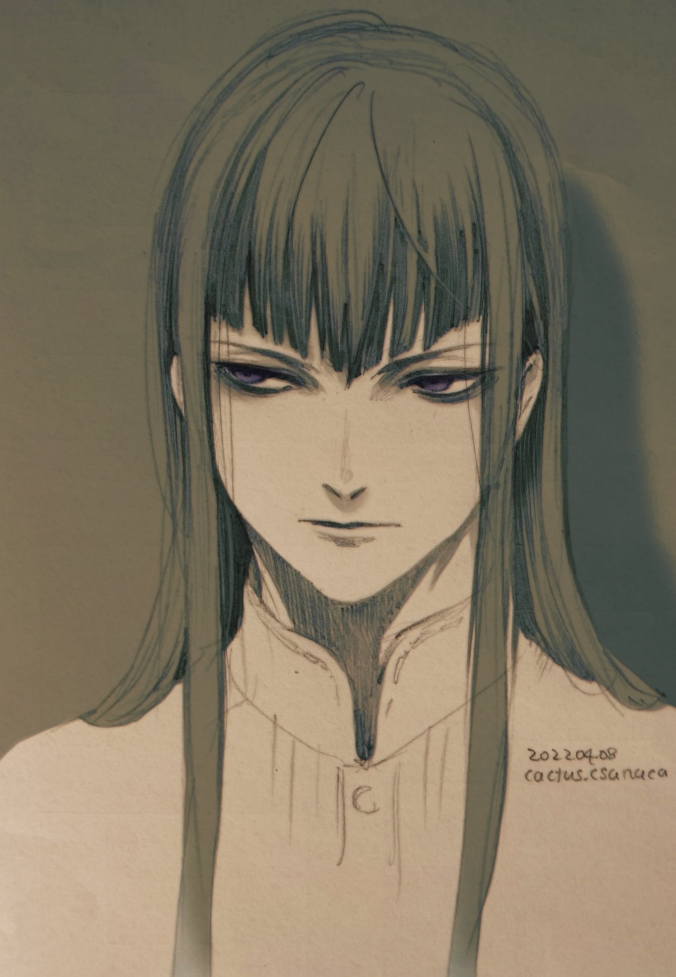 1boy closed_mouth csanaca dated harrison_dirk higeki_no_genkyou_tonaru_saikyou_gedou_last_boss_joou_wa_tami_no_tame_ni_tsukushimasu highres long_hair male_focus monochrome portrait purple_eyes sidelocks sideways_glance simple_background sketch solo spot_color twitter_username