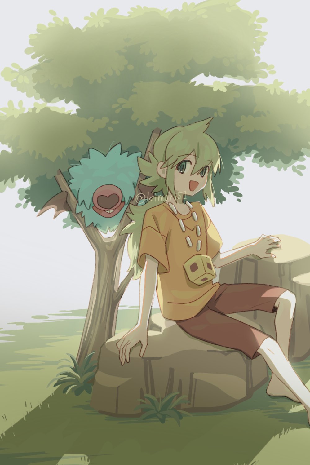 1boy :d aged_down arm_support barefoot brown_shorts commentary_request day gen_5_pokemon grass green_hair hair_between_eyes happy highres long_hair male_focus n_(pokemon) nagiru nintendo open_mouth outdoors pokemon pokemon_(creature) pokemon_black_and_white rock shirt short_sleeves shorts sitting smile t-shirt tree woobat