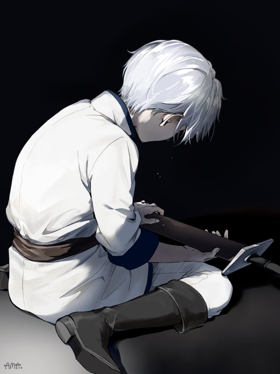 1boy ama_(amayadori_ok) arthur_beresford artist_name belt black_background boots child crying facing_down from_side grey_boots higeki_no_genkyou_tonaru_saikyou_gedou_last_boss_joou_wa_tami_no_tame_ni_tsukushimasu highres holding holding_sword holding_weapon jacket knee_boots long_sleeves male_focus on_ground pants sad sheath sheathed shoe_soles short_hair sitting sleeves_rolled_up solo sword wariza weapon white_hair white_jacket white_pants