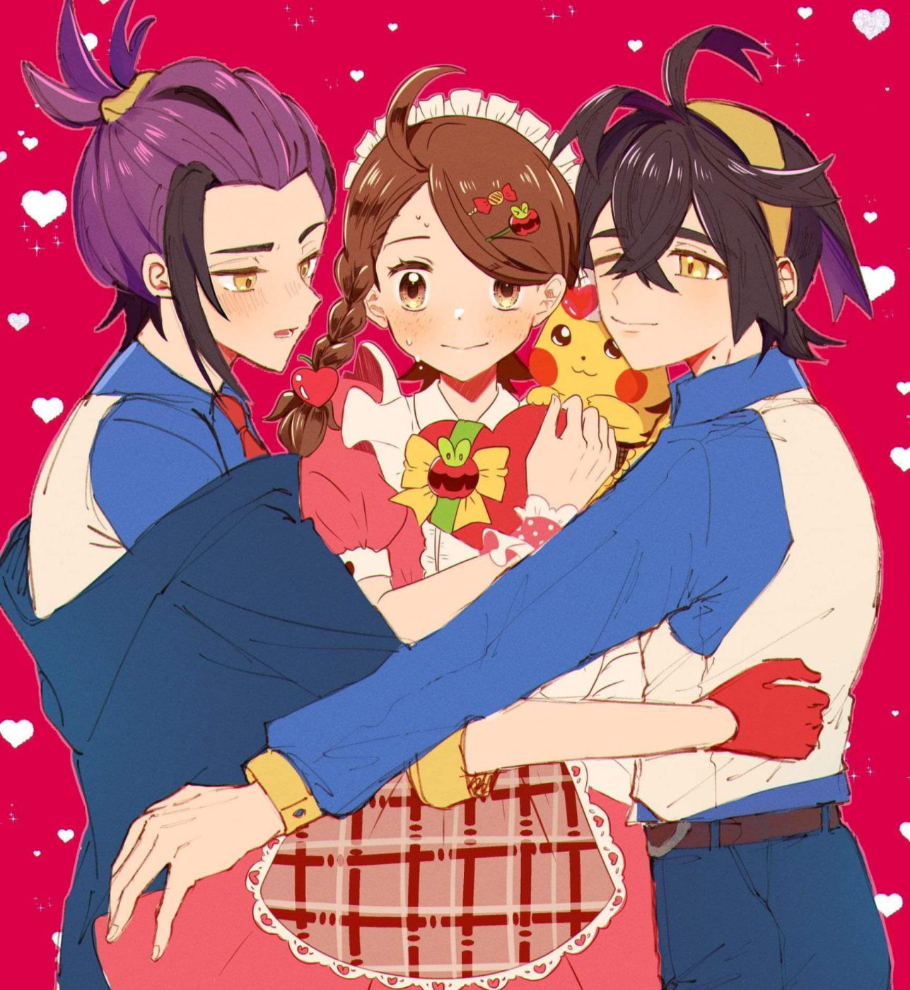 1girl 2boys ahoge alternate_costume apron belt blue_shirt blush box braid brown_belt brown_eyes brown_hair closed_mouth commentary_request dress eyelashes gen_1_pokemon gloves headdress heart heart-shaped_box highres juliana_(pokemon) kieran_(pokemon) long_sleeves multiple_boys necktie nintendo off_shoulder pants pikachu pink_background pink_dress pokemon pokemon_(creature) pokemon_scarlet_and_violet red_gloves red_necktie sakuya_990331 shirt short_sleeves sweat waist_apron wrist_cuffs