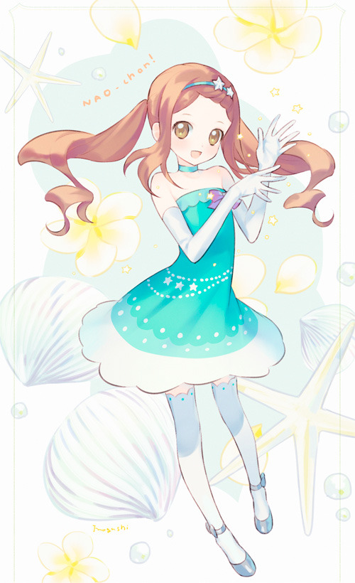 1girl :d bare_shoulders blue_choker blue_dress blue_hairband brown_eyes brown_hair character_name choker commentary_request dress ehime_nao elbow_gloves full_body gloves hair_ornament hairband hands_up inogashi long_hair looking_at_viewer low_twintails open_mouth pretty_series pripara seashell shell smile solo standing star_(symbol) star_hair_ornament starfish strapless strapless_dress thighhighs twintails very_long_hair white_gloves white_thighhighs