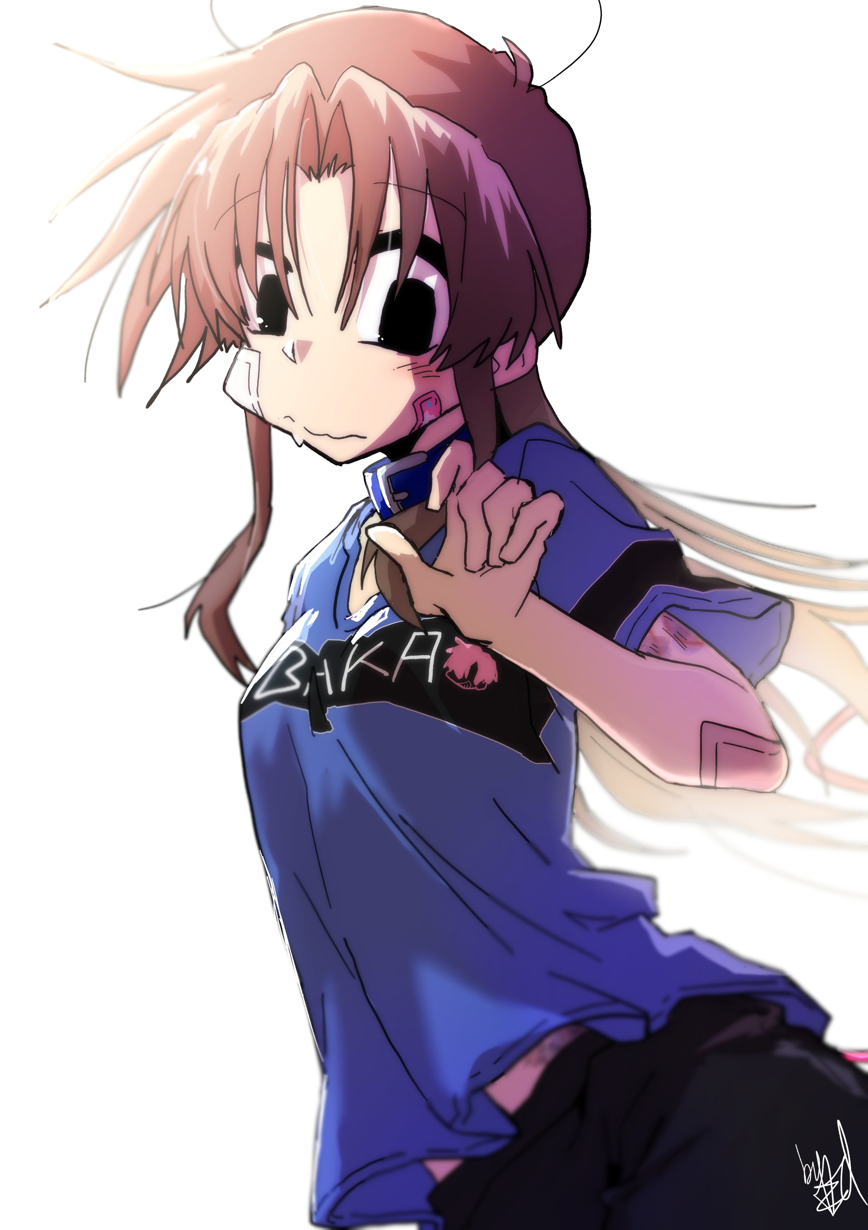 1girl absurdres bandaid bandaid_on_cheek bandaid_on_face black_eyes black_shorts blue_collar blue_shirt bruise closed_mouth collar ed-chan_(edkuroki) edkuroki gauze gauze_on_arm gauze_on_cheek hair_intakes highres injury light long_hair looking_to_the_side messy_hair original pink_tail print_shirt shirt shorts sidelocks signature simple_background solo sweatdrop tail wavy_mouth white_background