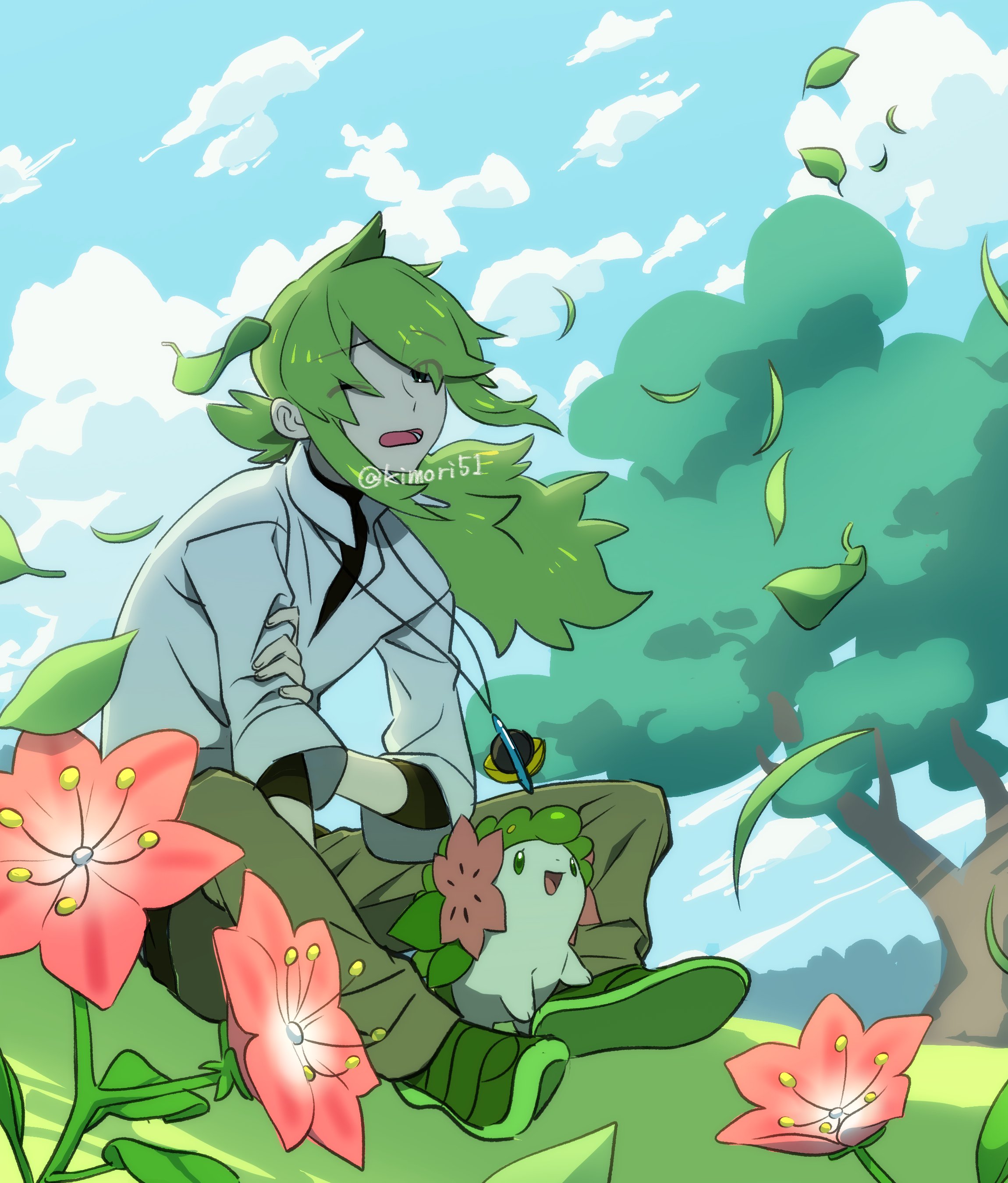 1boy absurdres cloud collared_shirt day falling_leaves floating_hair flower gen_4_pokemon grass green_footwear green_hair highres leaf legendary_pokemon long_hair male_focus mythical_pokemon n_(pokemon) nagiru nintendo one_eye_closed open_mouth outdoors pants pink_flower pokemon pokemon_(creature) pokemon_black_and_white shaymin shaymin_(land) shirt shoes sitting sky tree twitter_username undershirt watermark white_shirt
