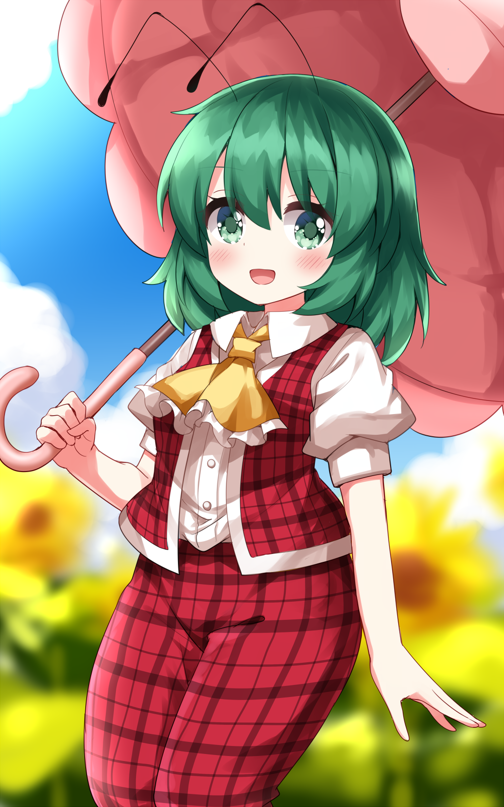1girl antennae ascot blurry blush collared_shirt commentary_request cosplay depth_of_field field flower flower_field green_eyes green_hair highres holding holding_umbrella kazami_yuuka kazami_yuuka_(cosplay) kazami_yuuka_(pc-98) long_hair looking_at_viewer open_clothes open_mouth open_vest pants parasol plaid_clothes plaid_pants plaid_vest puffy_short_sleeves puffy_sleeves red_pants red_vest ruu_(tksymkw) shirt short_sleeves skirt skirt_set smile solo sunflower sunflower_field touhou touhou_(pc-98) umbrella vest white_shirt wriggle_nightbug yellow_ascot