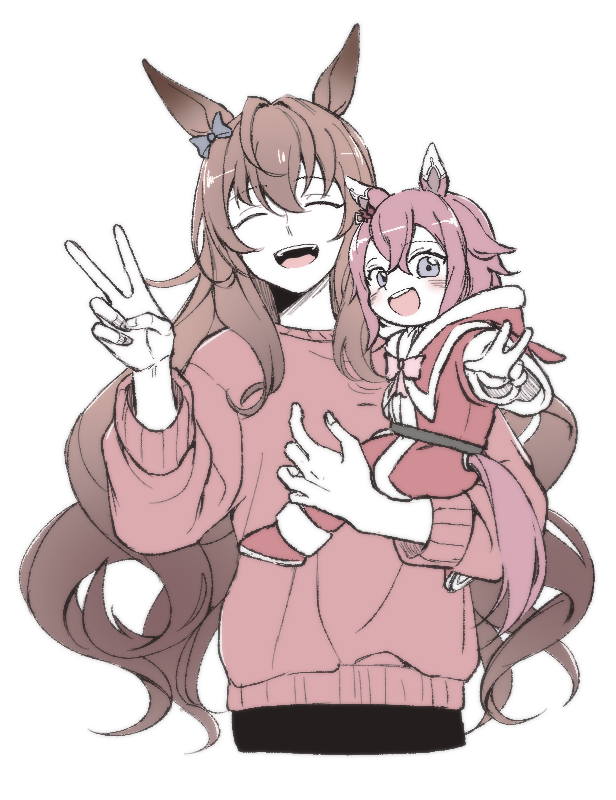 2girls aged_down animal_ears blue_eyes blush bow breasts brown_hair ear_bow hair_between_eyes hair_flaps hair_ornament horse_ears horse_girl horse_tail large_breasts long_hair looking_at_viewer maruzensky_(umamusume) multiple_girls open_mouth pink_hair sakura_chiyono_o_(umamusume) santa_costume shirt smile sweater tail taisaaa umamusume umamusume_horse_relations