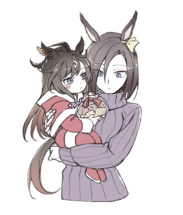 aged_down ahoge air_groove_(umamusume) animal_ears black_hair blue_eyes bow breasts brown_hair closed_mouth duramente_(umamusume) ear_bow ear_ornament food hair_between_eyes horse_ears horse_girl horse_tail korean_commentary long_hair medium_breasts muffin multicolored_hair santa_costume shirt short_hair simple_background streaked_hair tail taisaaa umamusume umamusume_horse_relations white_hair