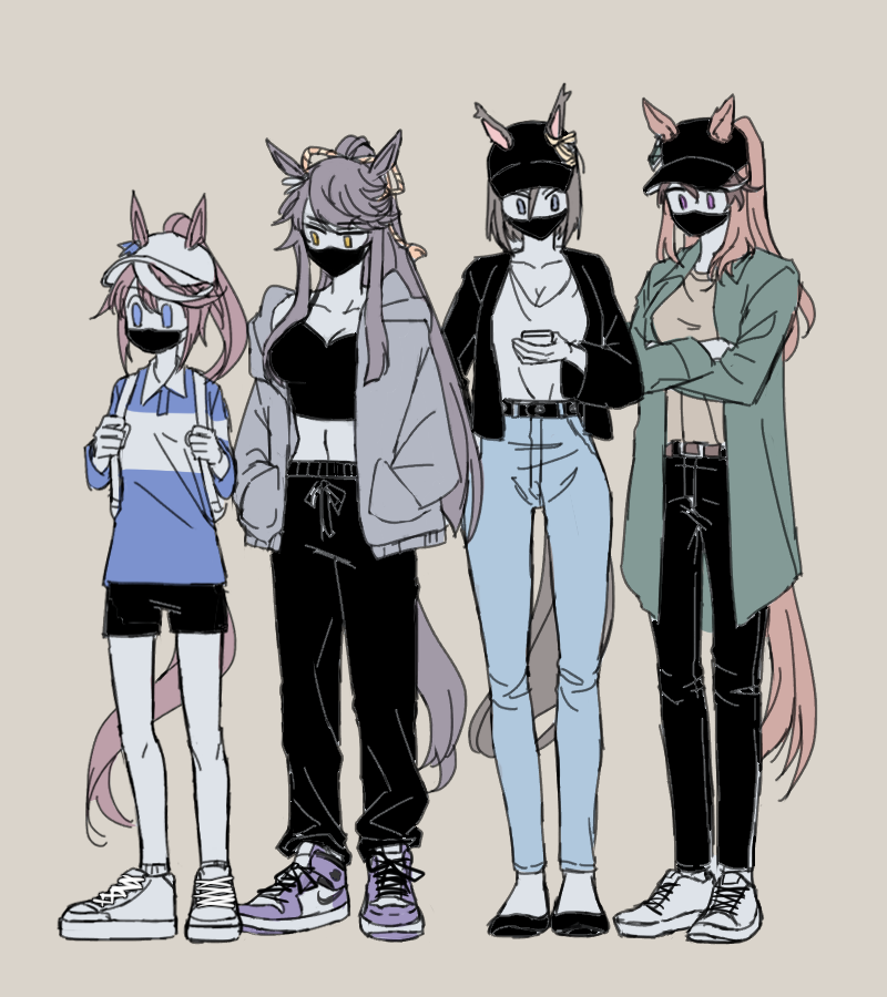 4girls air_groove_(umamusume) alternate_costume animal_ears backpack bag baseball_cap belt black_hair black_jacket black_pants black_shorts blue_eyes blue_shirt breasts brown_hair casual cellphone cleavage collared_shirt crop_top crossed_arms denim ears_through_headwear flats full_body green_jacket grey_jacket hair_through_headwear hands_in_pockets hat holding holding_phone horse_ears horse_girl horse_tail jacket jeans korean_commentary long_hair mask medium_breasts midriff mouth_mask multiple_girls narita_brian_(umamusume) navel open_clothes open_jacket pants phone ponytail purple_eyes rope shimenawa shirt shirt_tucked_in shoes short_hair shorts simple_background small_breasts sneakers standing symboli_rudolf_(umamusume) tail taisaaa tokai_teio_(umamusume) umamusume white_footwear white_headwear white_shirt yellow_eyes