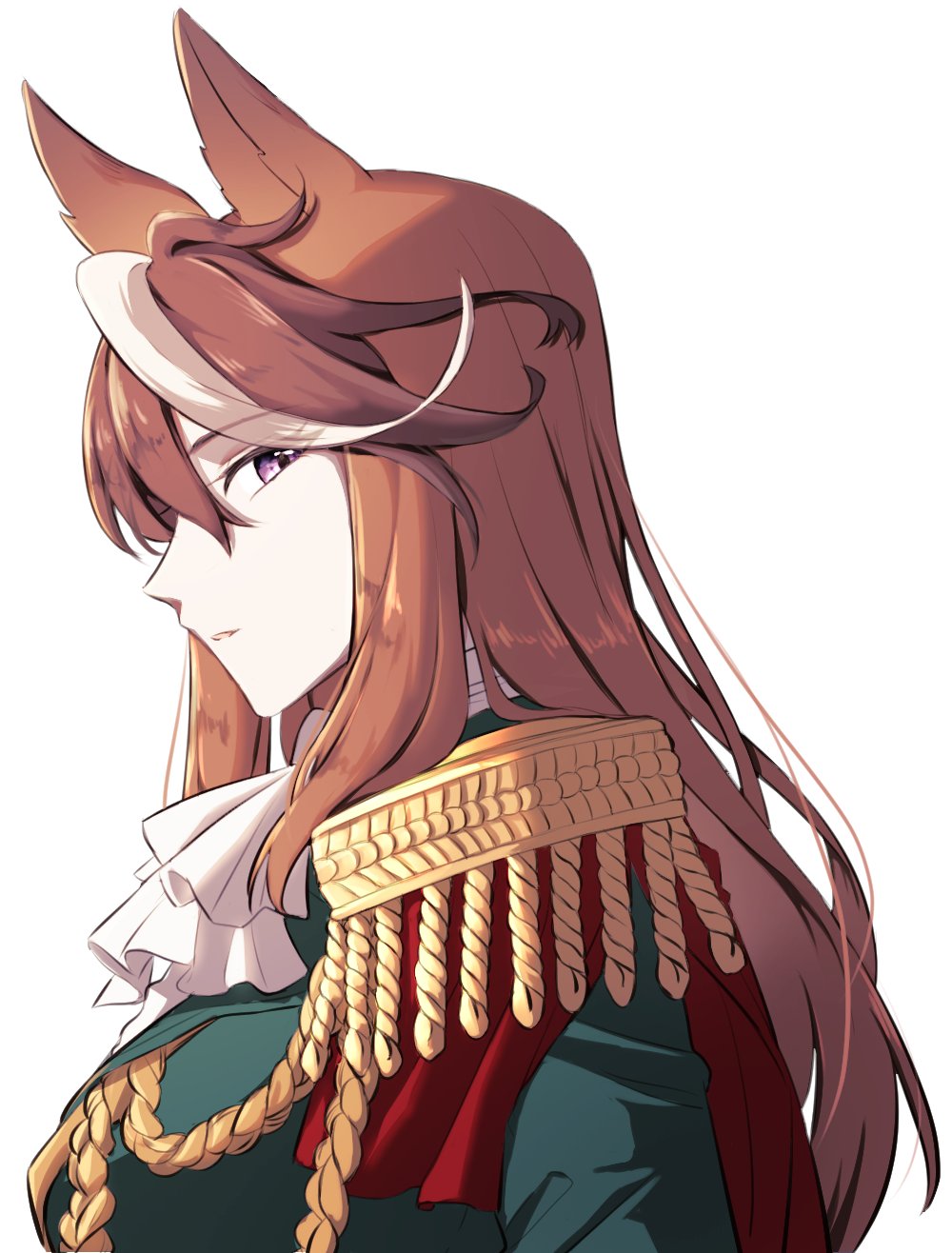 1girl animal_ears ascot brown_hair cape closed_mouth commentary_request crossed_arms epaulettes from_side green_shirt hair_between_eyes highres horse_ears horse_girl light_blush long_hair long_sleeves looking_at_viewer military_uniform multicolored_hair purple_eyes red_cape shirt side_cape sideways_glance single_epaulette solo streaked_hair symboli_rudolf_(umamusume) taisaaa umamusume upper_body very_long_hair white_ascot white_background white_hair