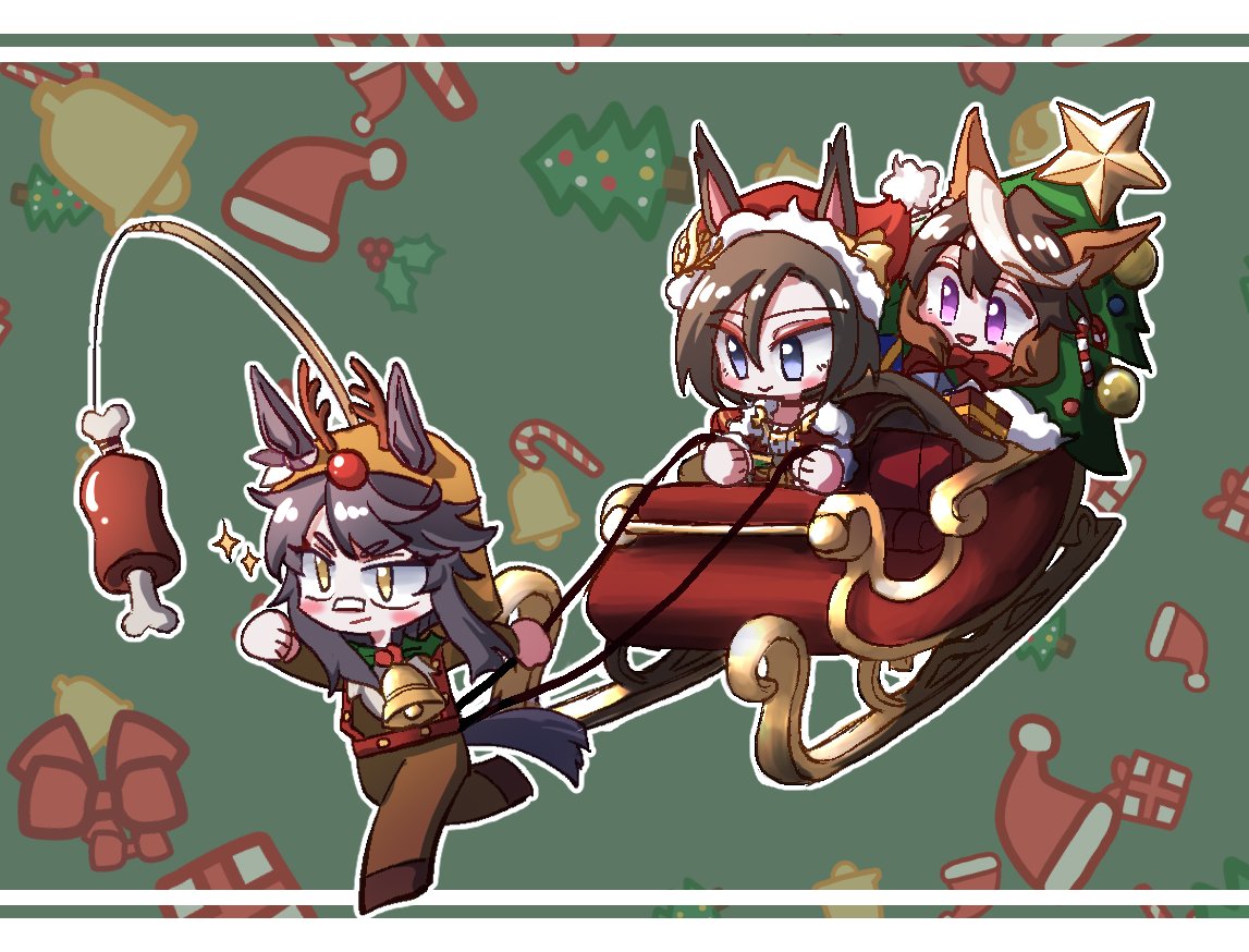3girls air_groove_(are_you_merry?)_(umamusume) air_groove_(umamusume) animal_costume animal_ears bandaid bandaid_on_face bandaid_on_nose bell black_hair blue_eyes box brown_hair candy candy_cane carrot_on_stick chest_harness chibi christmas_tree_costume clenched_hands closed_mouth food gift gift_box harness hat holding holding_reins holly horse_ears horse_girl horse_tail korean_commentary multiple_girls narita_brian_(umamusume) neck_bell open_mouth purple_eyes red_headwear reindeer_costume reins santa_hat short_hair sitting sleigh smile sparkle symboli_rudolf_(christmas_emperor_tree)_(umamusume) symboli_rudolf_(umamusume) tail taisaaa umamusume yellow_eyes