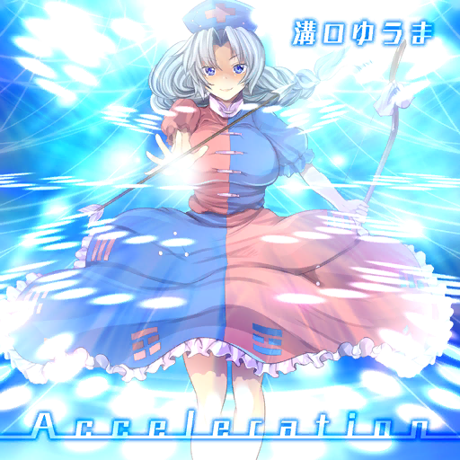 1girl album_cover arrow_(projectile) attack bare_legs blue_background blue_dress blue_eyes blue_hat blush bow bow_(weapon) braid circle_name collared_dress cover cross danmaku dress english_text frilled_dress frills game_cg glowing hat holding holding_arrow holding_bow_(weapon) holding_weapon long_hair m.h.s maki_(seventh_heaven_maxion) nurse_cap official_art parted_bangs petticoat puffy_short_sleeves puffy_sleeves red_cross red_dress short_sleeves single_braid solo spell_card touhou touhou_cannonball trigram two-tone_dress weapon white_bow white_hair yagokoro_eirin
