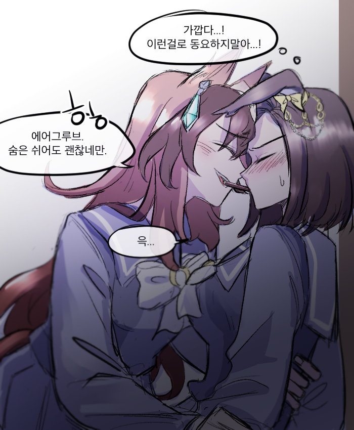 2girls air_groove_(umamusume) animal_ears arm_around_another's_back arm_grab blush bow breasts brown_hair closed_eyes ears_down face-to-face food horse_ears korean_text long_hair multiple_girls open_mouth pocky pocky_day pocky_kiss purple_shirt purple_skirt sailor_collar school_uniform shared_food shirt short_hair skirt small_breasts smile speech_bubble sweatdrop symboli_rudolf_(umamusume) taisaaa thought_bubble tracen_school_uniform translation_request umamusume upper_body yuri