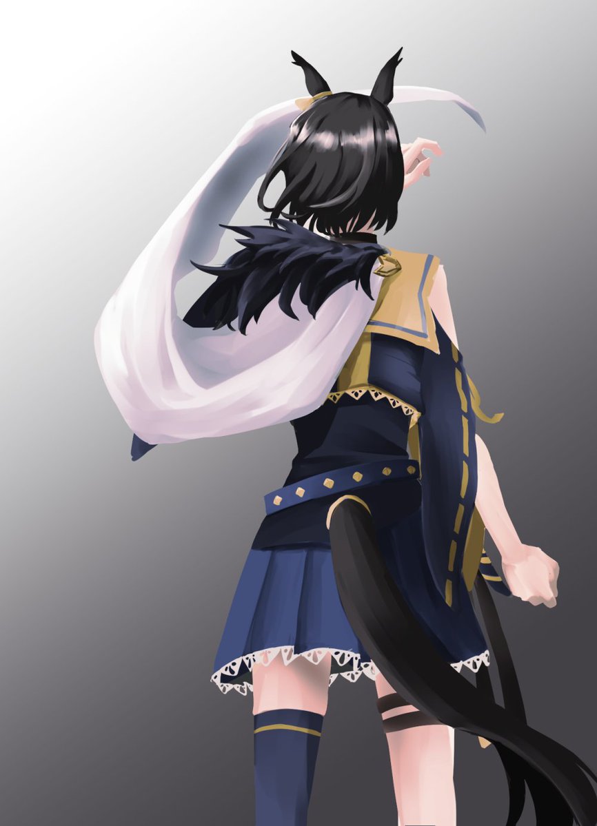 1girl air_groove_(umamusume) animal_ears arm_at_side black_hair blue_skirt choker clenched_hand clothing_cutout feet_out_of_frame from_behind gradient_background hand_up horse_ears horse_girl horse_tail korean_commentary short_hair shoulder_cutout side_cape single_thighhigh skirt solo standing tail tail_through_clothes taisaaa thigh_strap thighhighs umamusume wide_sleeves