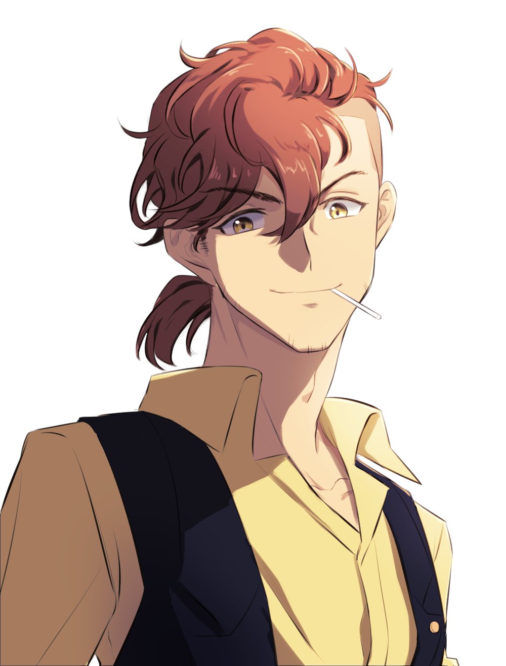 1boy asymmetrical_bangs black_vest brown_hair candy closed_mouth collared_shirt facial_hair food highres korean_commentary lollipop male_focus shirt short_hair simple_background smile stubble taisaaa team_spica's_trainer umamusume undercut upper_body vest white_background yellow_eyes yellow_shirt