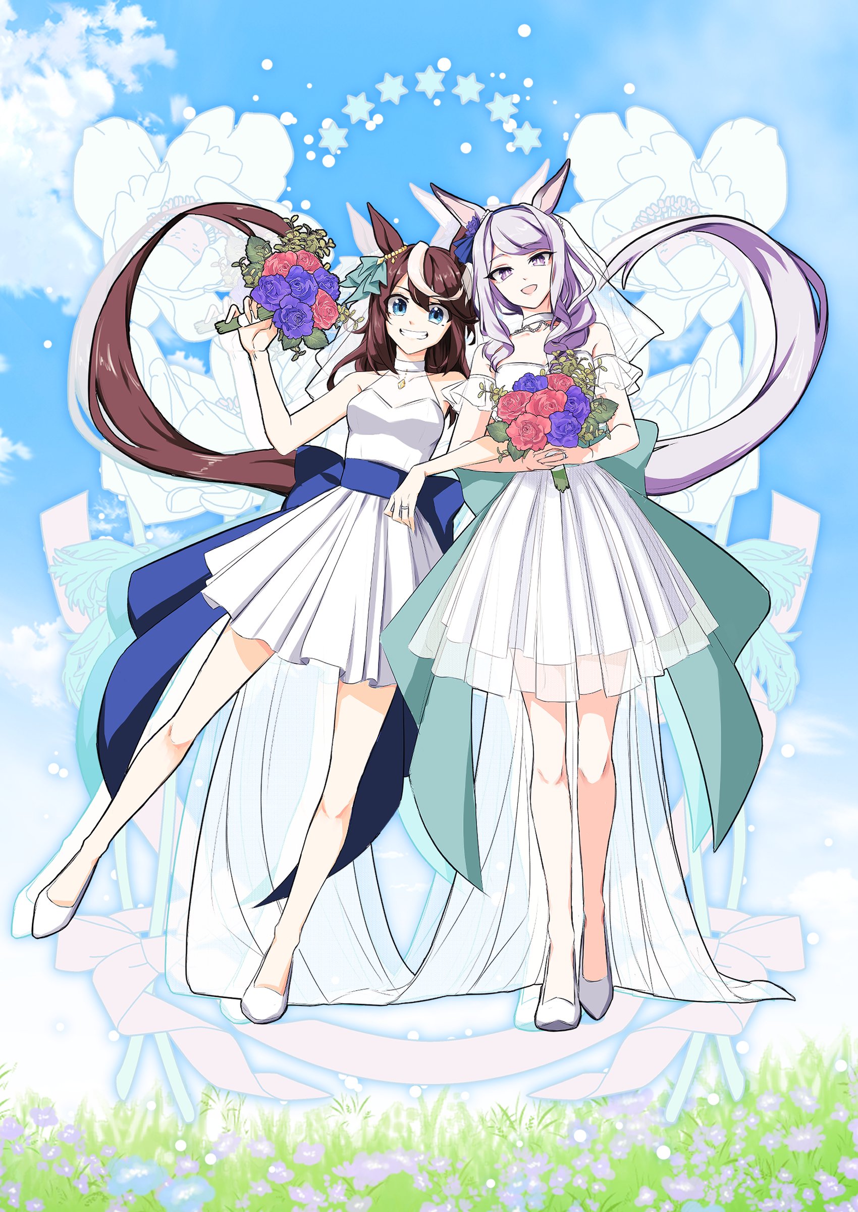 2girls absurdres alternate_costume animal_ears arm_garter bare_shoulders blue_eyes bouquet breasts bridal_veil bride brown_hair choker cloud dress drop_shadow female_focus flower full_body grass grin hair_down high_heels highres holding holding_bouquet horse_ears horse_girl horse_tail korean_commentary locked_arms long_hair looking_at_viewer mejiro_mcqueen_(umamusume) multicolored_hair multiple_girls open_mouth own_hands_together purple_eyes purple_hair sleeveless sleeveless_dress small_breasts smile streaked_hair tail taisaaa tokai_teio_(umamusume) umamusume veil wedding_dress white_dress white_footwear yuri