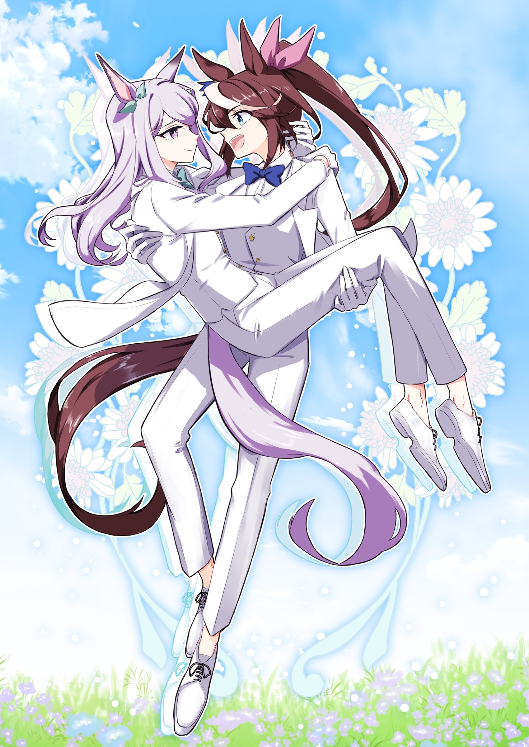 2girls absurdres alternate_costume animal_ears blue_eyes bow bowtie brown_hair carrying cloud drop_shadow eye_contact flower full_body gloves grass highres horse_ears horse_girl horse_tail jacket korean_commentary long_hair long_sleeves looking_at_another mejiro_mcqueen_(umamusume) multicolored_hair multiple_girls open_clothes open_jacket open_mouth oxfords pants ponytail princess_carry purple_eyes purple_hair shirt smile streaked_hair tail taisaaa tokai_teio_(umamusume) umamusume vest white_footwear white_gloves white_jacket white_pants white_shirt white_vest yuri