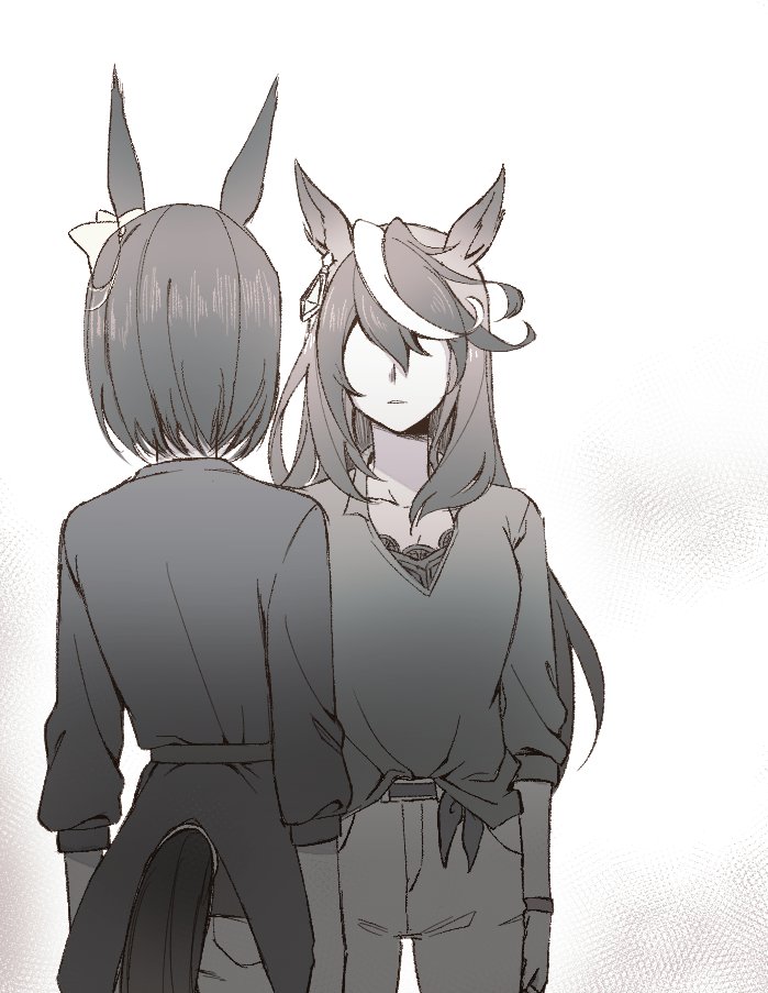 2girls air_groove_(umamusume) animal_ears arms_at_sides clothing_cutout cowboy_shot earrings faceless faceless_female greyscale horse_ears horse_girl horse_tail jewelry korean_commentary long_hair long_sleeves monochrome multicolored_hair multiple_girls pants parted_lips shirt shirt_partially_tucked_in short_hair single_earring standing streaked_hair symboli_rudolf_(umamusume) tail tail_through_clothes taisaaa umamusume wristband