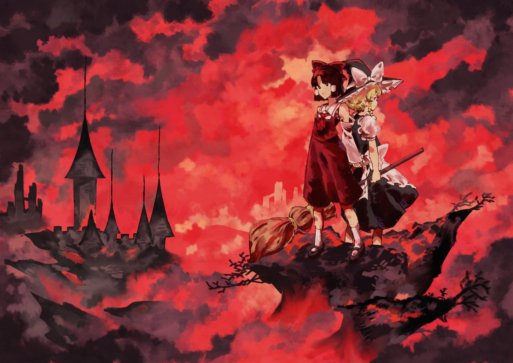 2girls apron ascot back-to-back bare_arms black_dress black_footwear blonde_hair bow braid branch breasts bright_pupils broom brown_eyes brown_hair castle closed_mouth cloud dome dress fog frilled_apron frilled_hat frills full_body hair_bow hair_tubes hakurei_reimu hat hat_bow highres holding holding_broom holding_stick kirisame_marisa mary_janes medium_hair multiple_girls oftooon outdoors profile puffy_short_sleeves puffy_sleeves red_ascot red_bow red_skirt red_sky red_theme red_vest sailor_collar shoes short_sleeves single_braid skirt sky small_breasts socks standing stick touhou vest white_apron white_bow white_pupils white_sailor_collar white_socks witch_hat