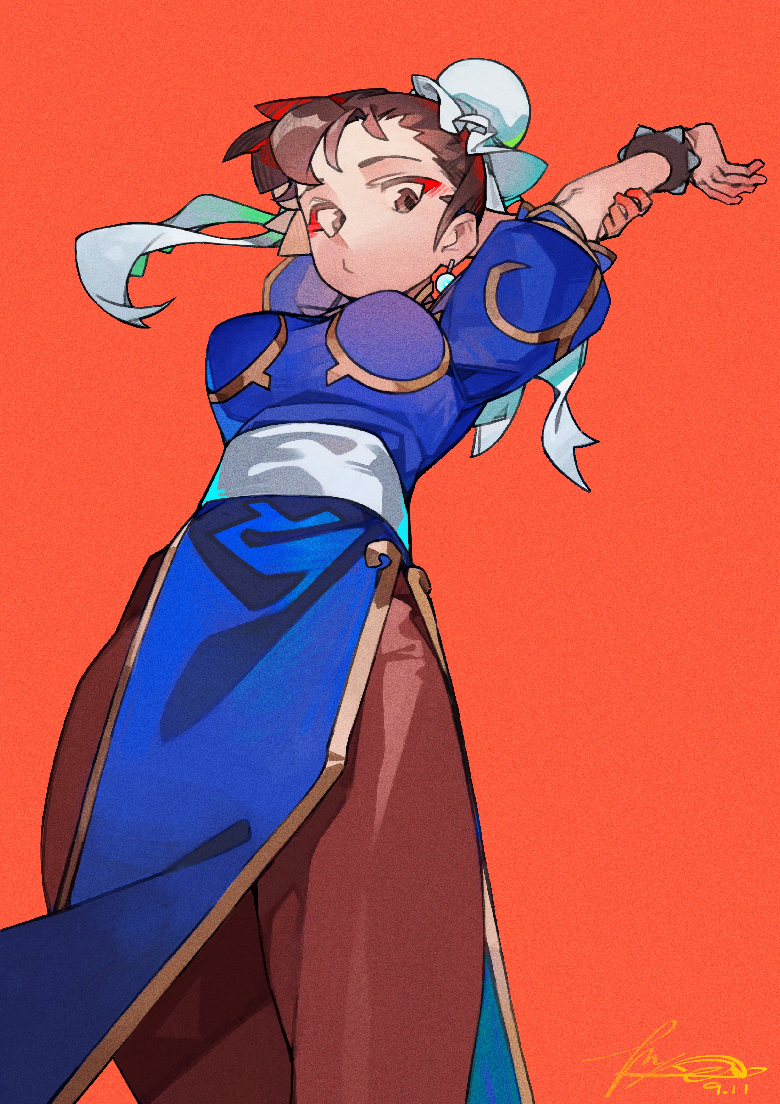 1girl absurdres arm_behind_head arm_up arms_up belt blue_dress breasts brown_eyes brown_hair brown_pants bun_cover capcom china_dress chinese_clothes chun-li closed_mouth dated dress earrings from_below gold_trim hair_bun hair_ribbon highres jewelry linween looking_at_viewer looking_down medium_breasts pants pelvic_curtain red_background ribbon short_hair signature solo standing street_fighter stretching white_belt white_ribbon