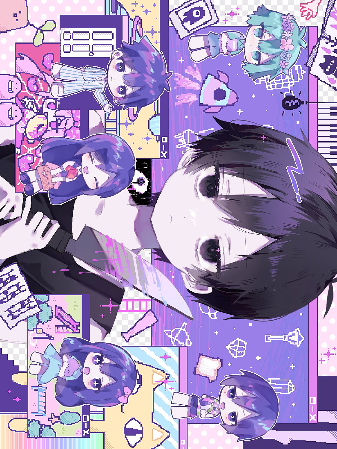 +_+ 2girls 4boys ^_^ aegyo_sal aqua_hair aubrey_(headspace)_(omori) aubrey_(omori) bag ball basil_(headspace)_(omori) basil_(omori) black_eyes black_hair black_tank_top blood bloody_knife blue_dress blue_eyes bow bright_pupils chibi closed_eyes commentary dress expressionless flower_wreath hair_bow head_wreath hero_(headspace)_(omori) hero_(omori) highres hiro_0607 holding holding_bag holding_ball holding_knife holding_stuffed_toy kel_(headspace)_(omori) kel_(omori) knife light_bulb looking_at_viewer male_focus mari_(headspace)_(omori) mari_(omori) multiple_boys multiple_girls neckerchief omori omori_(omori) open_mouth outline pajamas pink_blood pixelated purple_eyes purple_hair purple_shorts purple_theme red_neckerchief rocket short_hair shorts sideways smile solo_focus sparkle striped_clothes striped_pajamas stuffed_toy stylized_blood untranslatable_commentary tank_top upper_body white_outline white_pupils window_(computing)