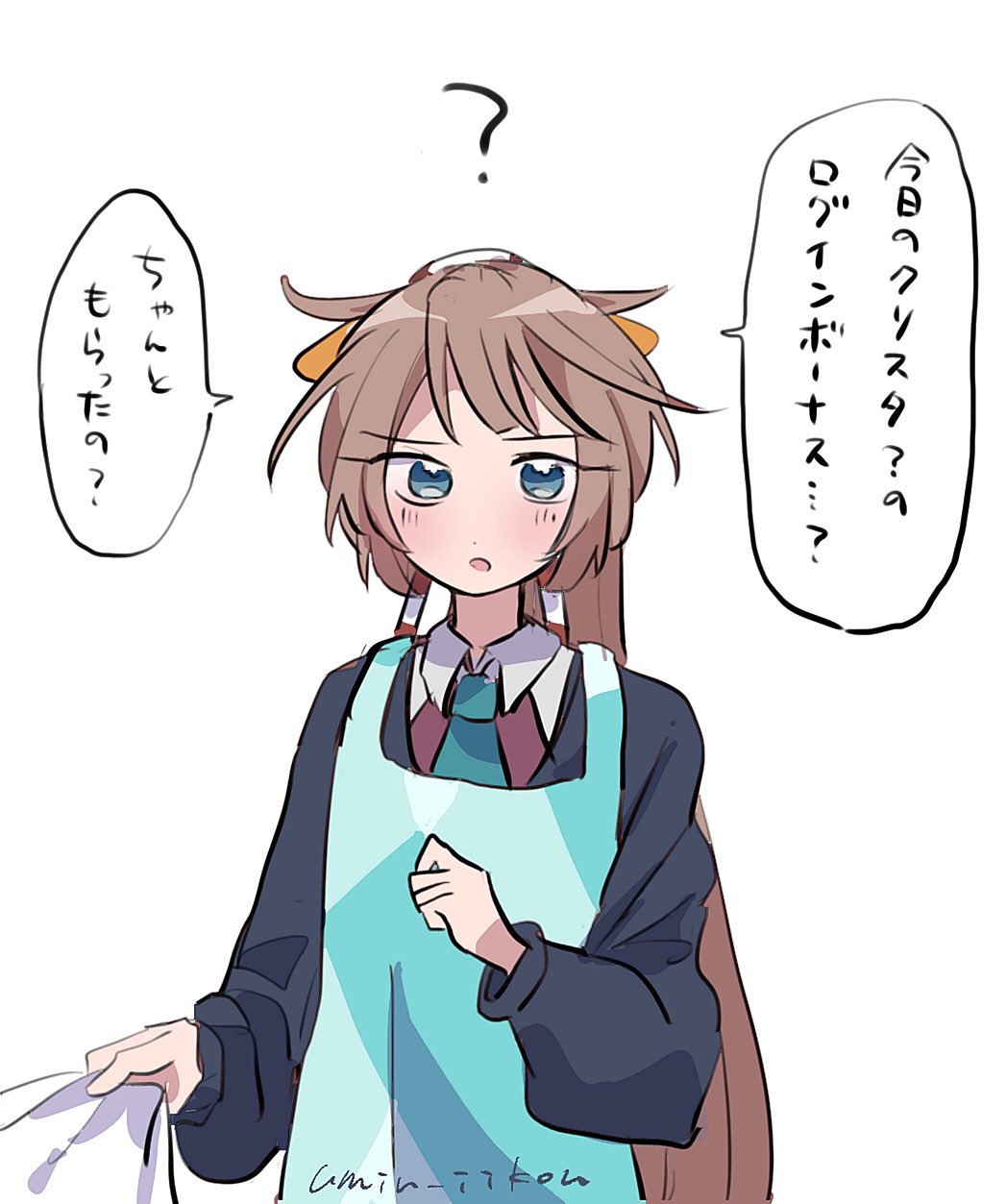 1girl ? apron aqua_necktie black_sweater blue_apron brown_hair collared_shirt commentary_request cowboy_shot dress dress_shirt grey_hair hair_ribbon halter_dress halterneck highres kantai_collection kazagumo_(comiket)_(kancolle) kazagumo_(kancolle) long_hair necktie ribbon samekun_(samekun_s) shirt simple_background solo sweater translation_request twitter_username white_background white_shirt
