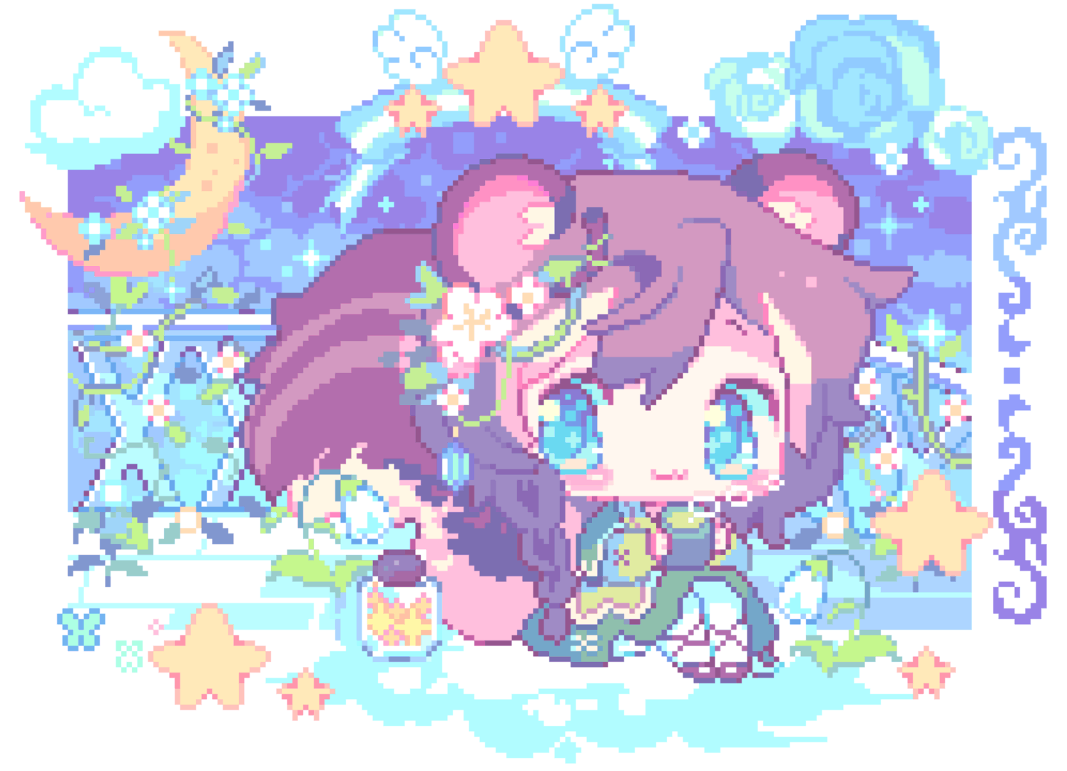1girl :3 animal_ears black_ribbon black_shoes blonde_hair blue_eyes blue_flower blue_rose border braid brown_hair chibi closed_mouth cloud commentary crescent_moon cross-laced_clothes cross-laced_sleeves cup dress drink flower full_body green_dress green_sleeves green_tea hair_flower hair_ornament holding holding_drink knees_up leg_ribbon light_blush long_hair long_sleeves looking_at_viewer medium_dress moon multicolored_hair night original pantyhose pixel_art puffy_long_sleeves puffy_sleeves railing ribbon rose shoes single_braid sitting sky smile solo squirrel_ears squirrel_tail star_(sky) star_(symbol) steam streaked_hair untranslatable_commentary tail tea uki_(ukierr) white_border white_flower white_pantyhose yunomi