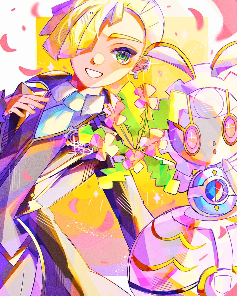 1boy blonde_hair ear_piercing flower gen_7_pokemon gladion_(pokemon) gladion_(sygna_suit)_(pokemon) green_eyes hair_over_one_eye legendary_pokemon magearna magearna_(normal) male_focus mythical_pokemon nfvw2evamr86075 nintendo official_alternate_costume petals piercing pink_flower pokemon pokemon_(creature) pokemon_masters_ex