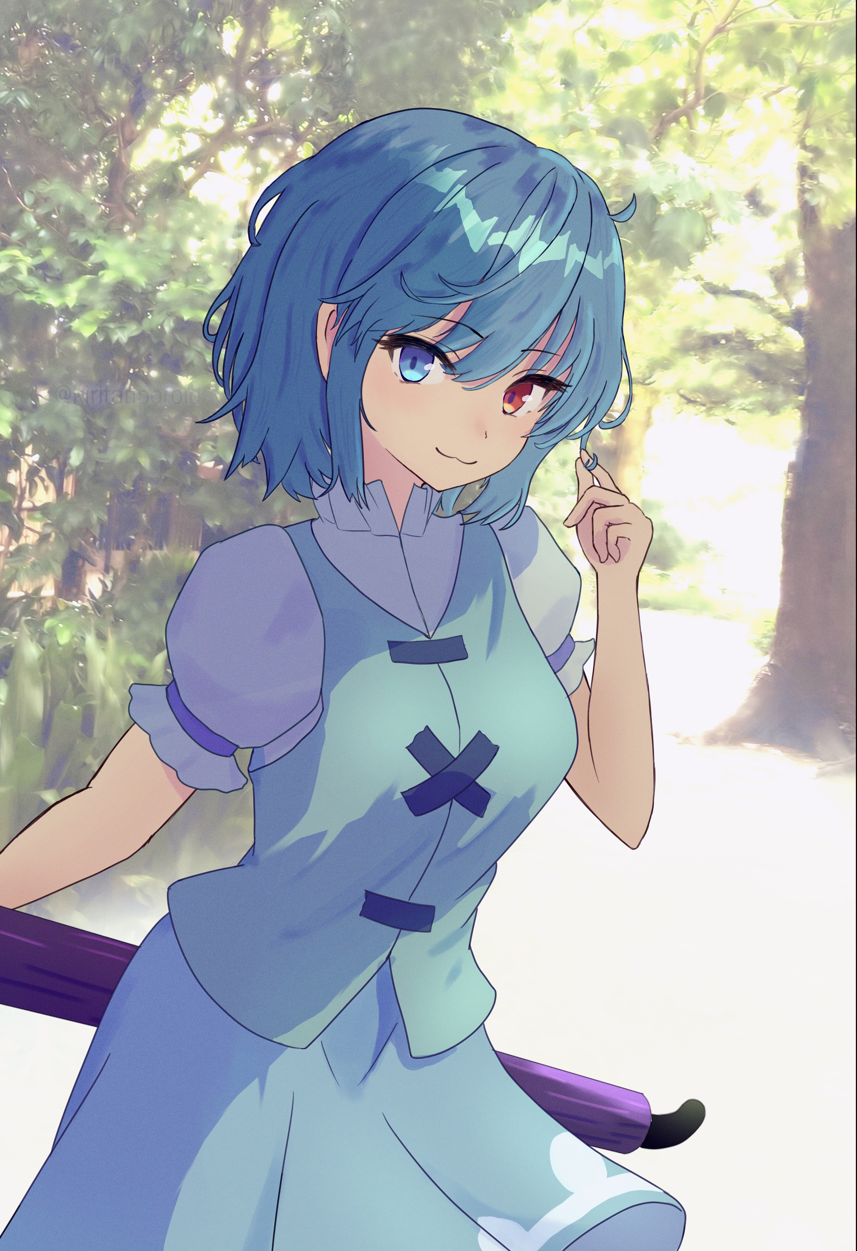 1girl :3 absurdres blue_eyes blue_hair blue_skirt blue_vest closed_mouth collared_shirt commentary cowboy_shot day hair_between_eyes hand_up highres holding holding_umbrella kiritanpo117 looking_at_viewer outdoors photo_background playing_with_own_hair puffy_short_sleeves puffy_sleeves red_eyes shirt short_hair short_sleeves skirt smile solo tatara_kogasa touhou tsurime umbrella vest white_shirt