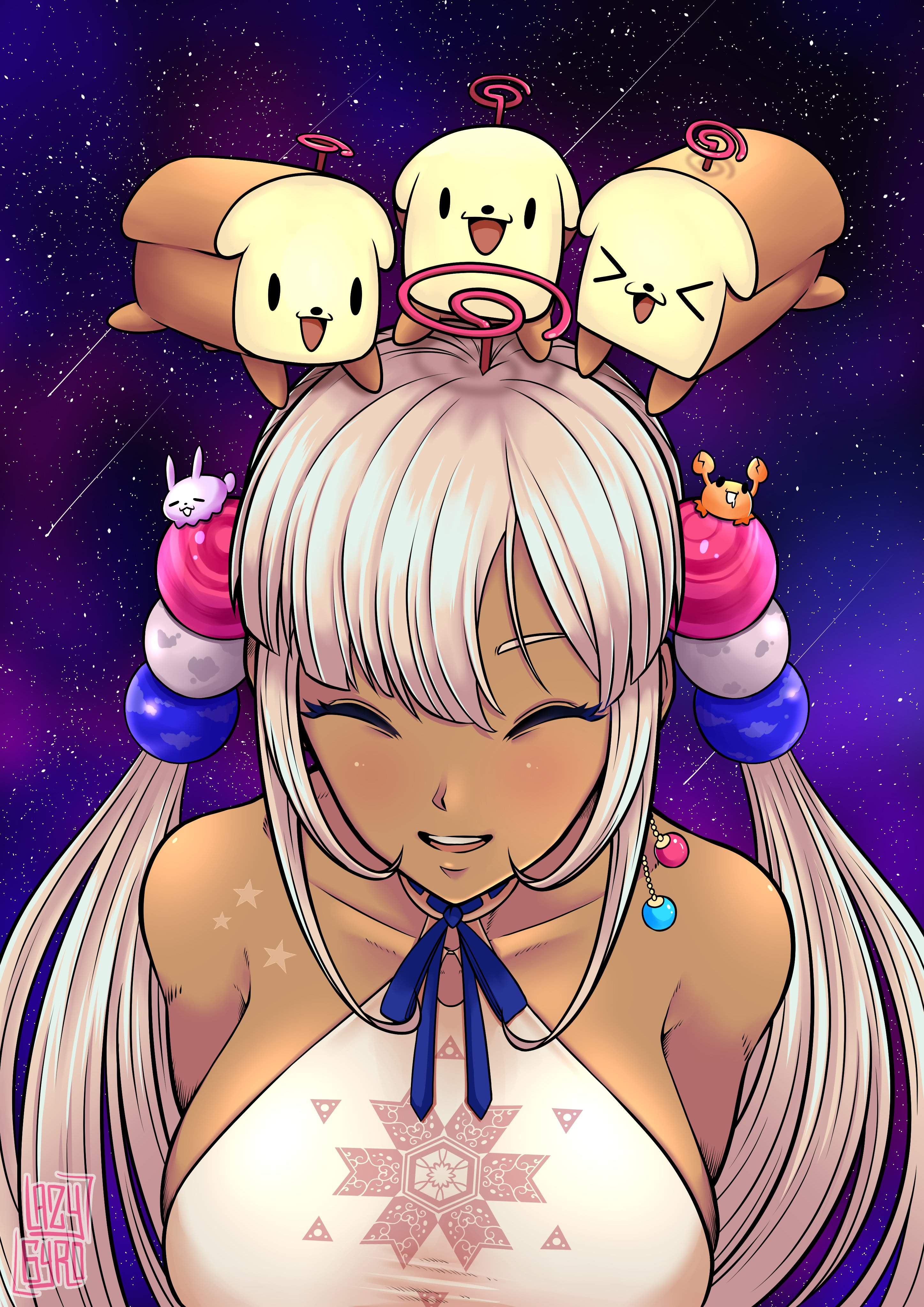 1girl absurdres armpit_crease blonde_hair breasts commentary crab dark-skinned_female dark_skin english_commentary eyebrows_hidden_by_hair hair_ornament halterneck highres hololive hololive_english kaniko_(tsukumo_sana) large_breasts limiter_(tsukumo_sana) parted_lips planet_hair_ornament reizicherry sanallite_(tsukumo_sana) shooting_star sideboob sidelocks signature smile space star_(sky) tsukumo_sana twintails upper_body usaslug_(tsukumo_sana) virtual_youtuber