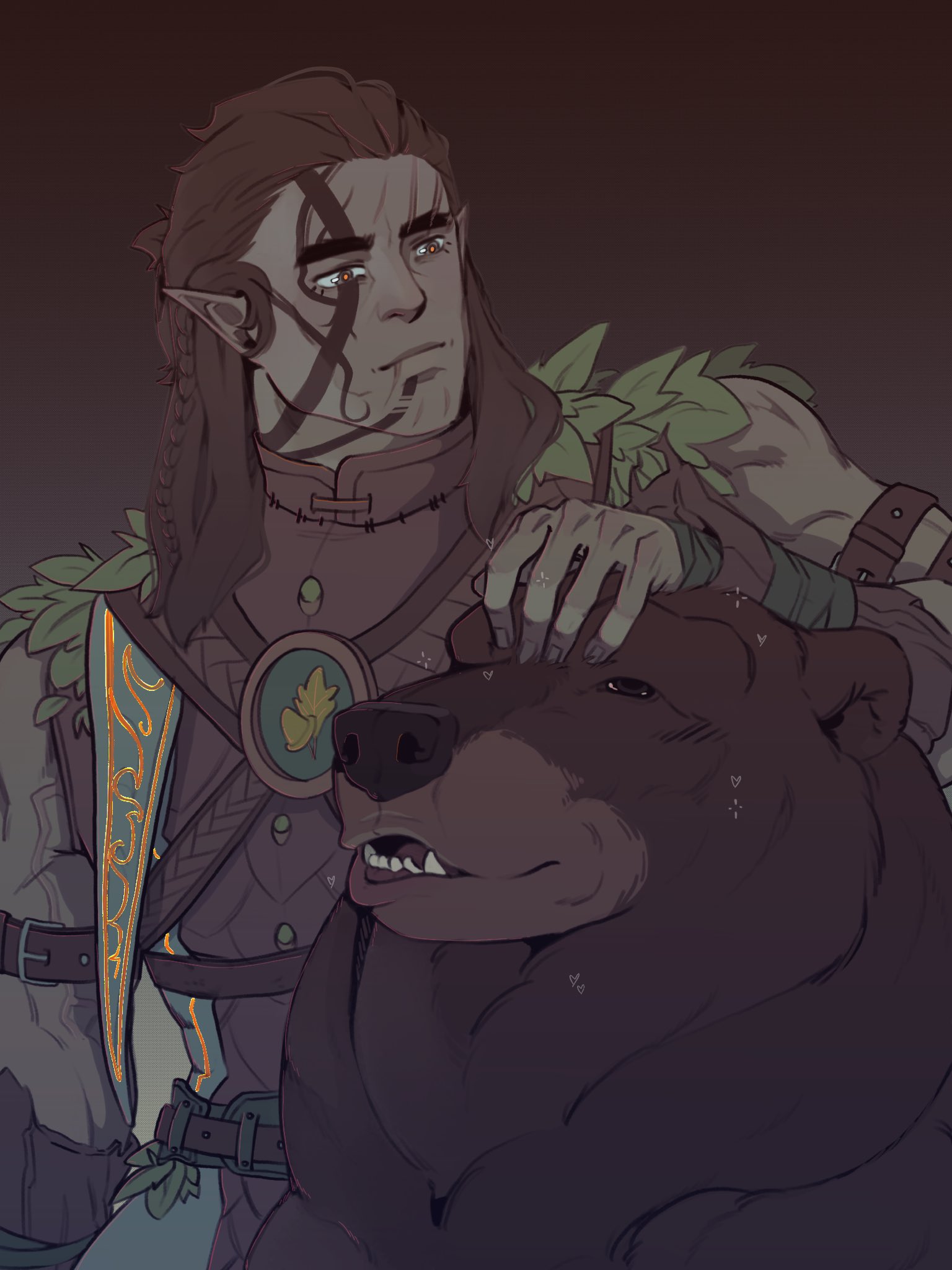 1boy affectionate baldur's_gate baldur's_gate_3 bear brown_hair brown_theme dark-skinned_male dark_skin elf halsin happy_aura highres maison_(6_maison_6) male_focus mature_male medium_hair muscular muscular_male pectorals petting pointy_ears solo thick_eyebrows trait_connection upper_body veins veiny_arms