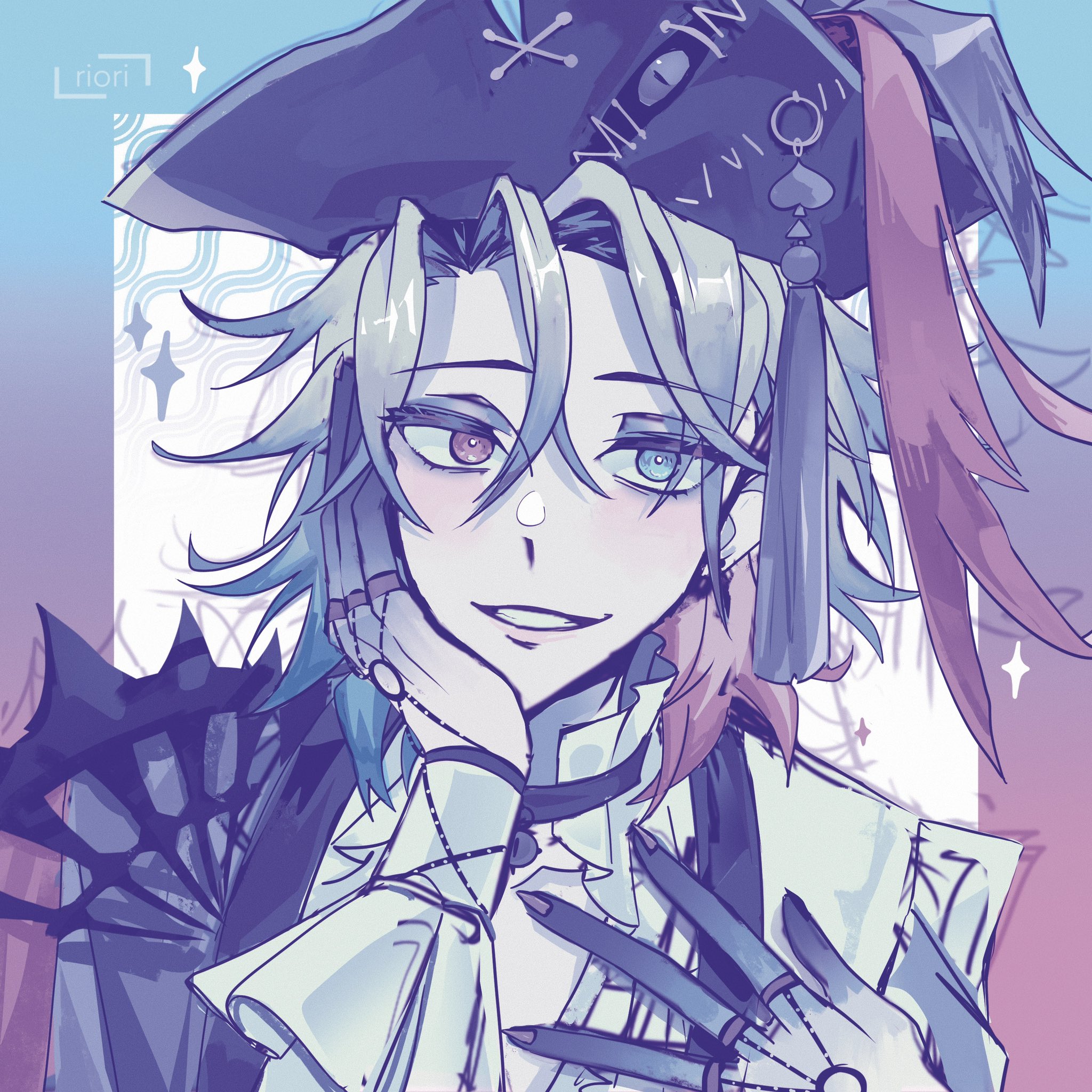 1boy artist_name bishounen black_choker black_eyeshadow black_hat black_nails black_skin blue_eyes blue_hair choker colored_skin commentary earrings english_commentary eyeshadow frilled_shirt frills gavis_bettel gavis_bettel_(2nd_costume) gradient_background gradient_skin grey_hair hair_between_eyes hat heterochromia highres holostars holostars_english jewelry looking_to_the_side makeup male_focus multicolored_hair multiple_rings parted_lips pink_eyes pink_hair portrait ring riori shirt smile solo virtual_youtuber white_skin