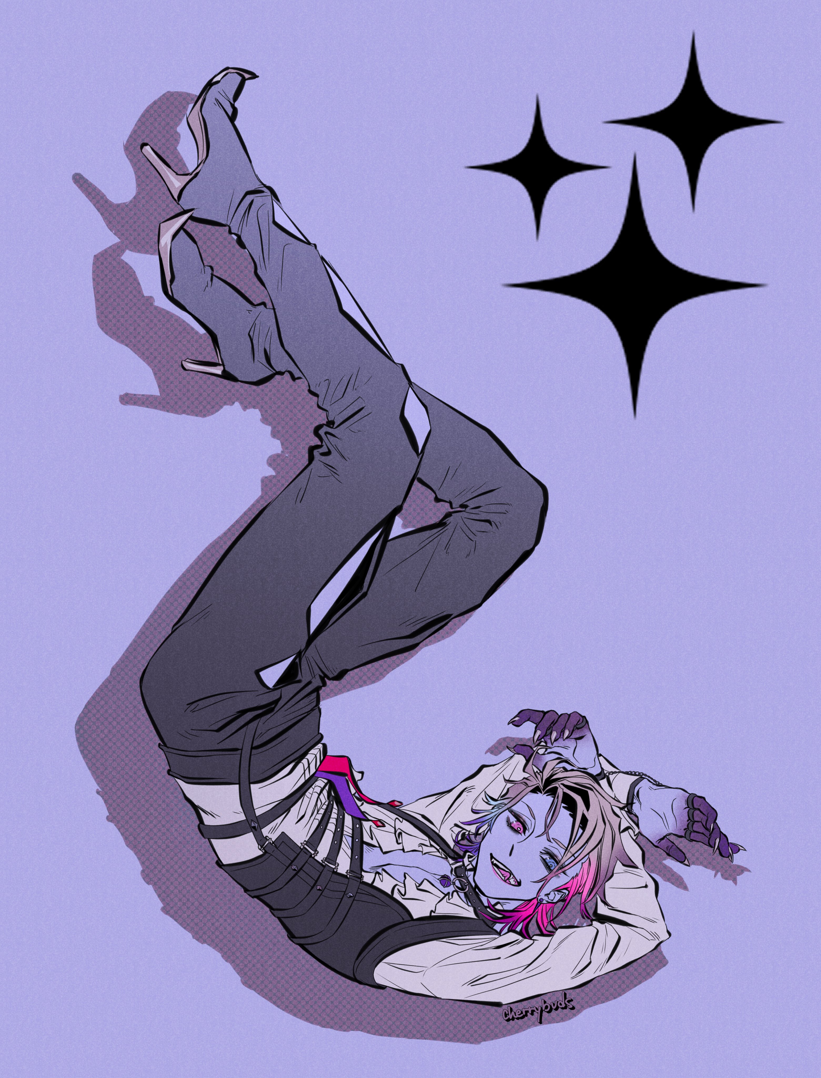 1boy absurdres arms_up artist_name bishounen black_choker blue_eyes blue_hair boots cherrybuds choker claws commentary english_commentary frilled_shirt frills full_body gavis_bettel gavis_bettel_(2nd_costume) gradient_skin grey_hair heterochromia high_heel_boots high_heels highres holostars holostars_english jewelry looking_to_the_side male_focus multiple_rings pink_eyes pink_hair purple_background purple_hair ring ringed_eyes shadow shirt short_hair smile solo sparkle star_(symbol) tongue tongue_out virtual_youtuber white_shirt