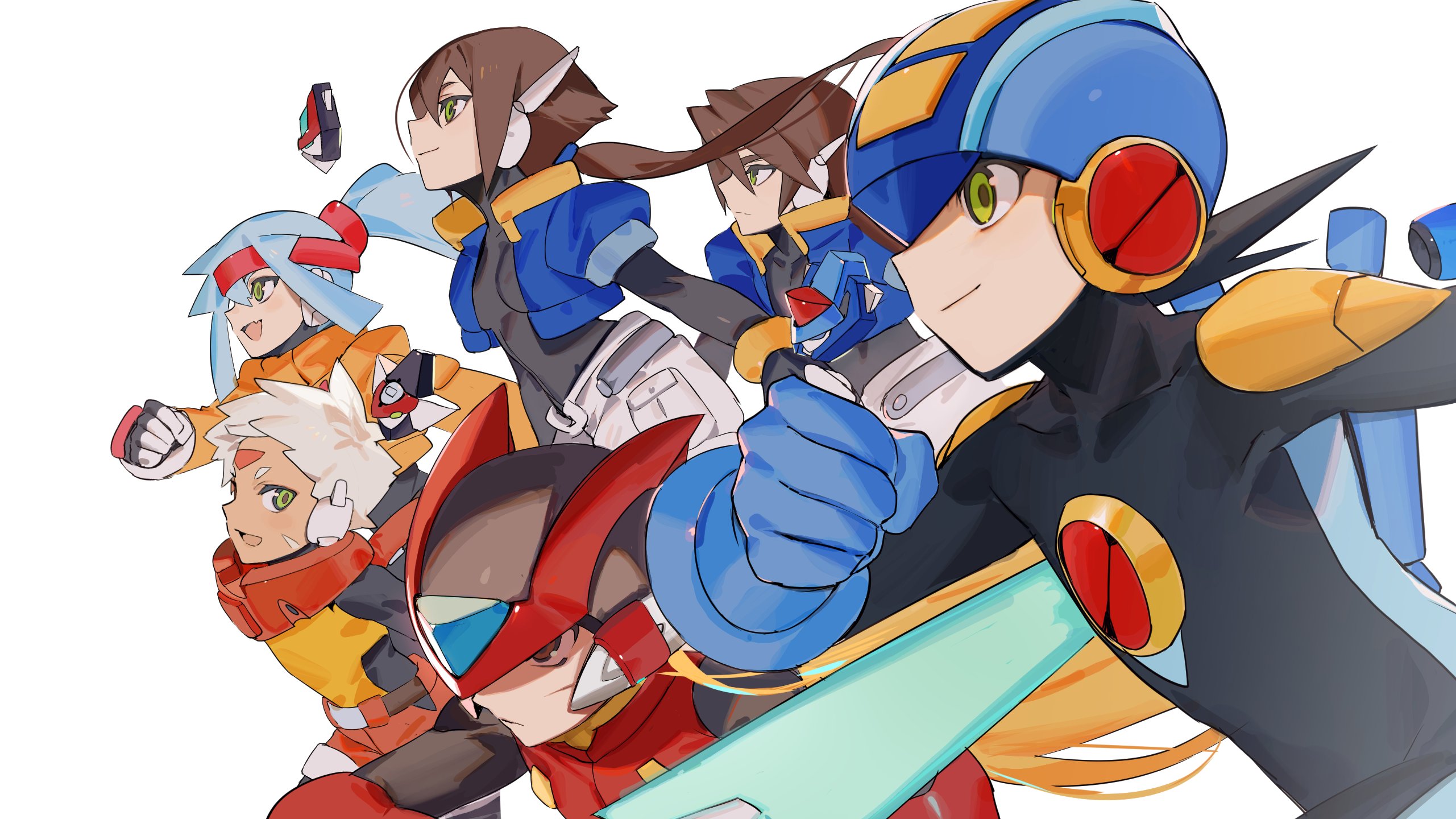 2girls 4boys aile_(mega_man_zx) ashe_(mega_man) black_bodysuit blonde_hair blue_hair blue_jacket bodysuit bodysuit_under_clothes brown_hair cropped_jacket energy_sword facial_mark fang forehead_jewel forehead_mark green_eyes grey_(mega_man) grey_hair helmet high_ponytail highres holding holding_sword holding_weapon jacket light_blue_hair long_hair mayutsuba_mono mega_man_(series) mega_man_battle_network_(series) mega_man_zero_(series) mega_man_zx mega_man_zx_advent megaman.exe model_a_(mega_man) model_x_(mega_man) model_z_(mega_man) multiple_boys multiple_girls open_clothes open_jacket pants ponytail short_hair shorts skin_fang spiked_hair sword vent_(mega_man) weapon white_pants white_shorts zero(z)_(mega_man) zero_(mega_man)