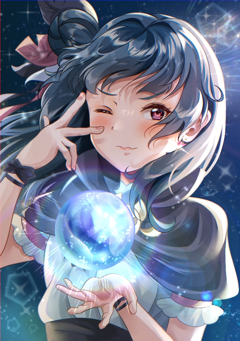 1girl blue_hair genjitsu_no_yohane hair_bun long_hair looking_at_viewer love_live!_sunshine!! one_eye_closed purple_eyes single_hair_bun smile solo tsubasa091748 tsushima_yoshiko