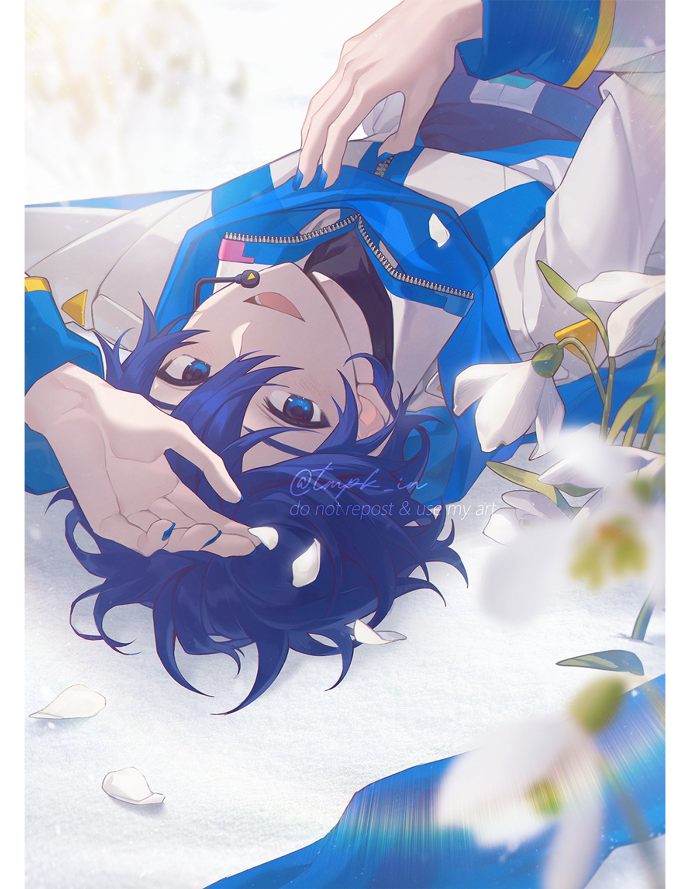 1boy 1c3ink3tk4n backlighting belt black_sweater blue_belt blue_eyes blue_hair blue_nails blue_scarf blurry blurry_background coat dark_blue_hair depth_of_field fingernails floor flower flower_request hair_between_eyes hand_on_own_chest hand_rest hand_up happy headset highres holding holding_petal kaito_(vocaloid) kaito_(vocaloid3) leaf lens_flare light_blush light_particles looking_at_viewer looking_up lying male_focus messy_hair on_back on_floor open_mouth partially_unzipped petals pillarboxed scarf see-through_clothes see-through_scarf smile sunlight sweater tsurime turtleneck turtleneck_sweater twitter_username upper_body upside-down vocaloid white_coat white_flower zipper