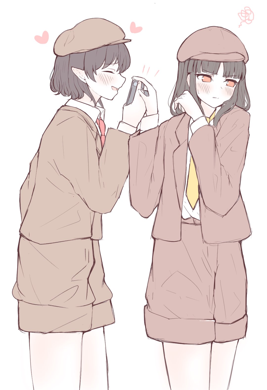 2girls black_hair blush brown_hair brown_headwear brown_jacket brown_shorts newsboy_cap closed_eyes collared_shirt commentary cosplay hakurei_reimu hat heart highres jacket long_hair long_sleeves multiple_girls necktie open_mouth pointy_ears red_eyes red_necktie seele_(chanseele0128) shameimaru_aya shameimaru_aya_(cosplay) shameimaru_aya_(newsboy) shirt short_hair shorts smile squiggle suit_jacket sweatdrop touhou white_shirt yellow_necktie